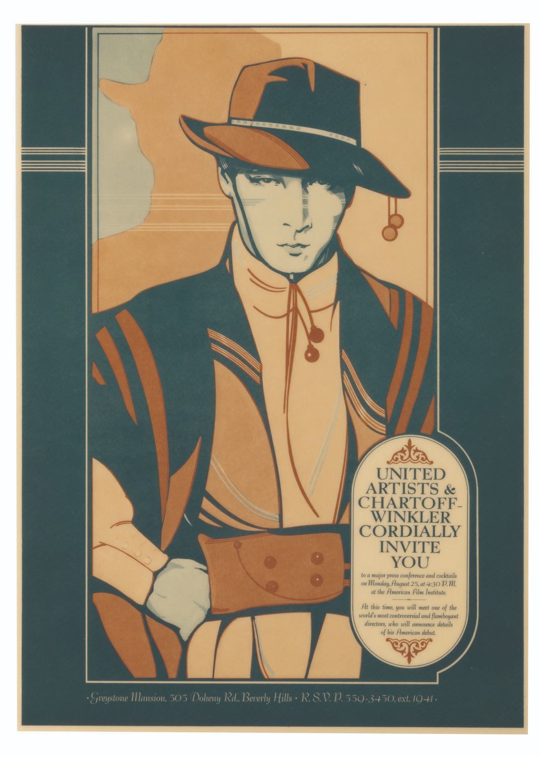 (UA, 1975) A press conference invitation from United Artists. The text announces a"flamboyant director’s American debut" will be announced. Measuring 10.5" x 14.5" the laminated invitation is in fine condition.