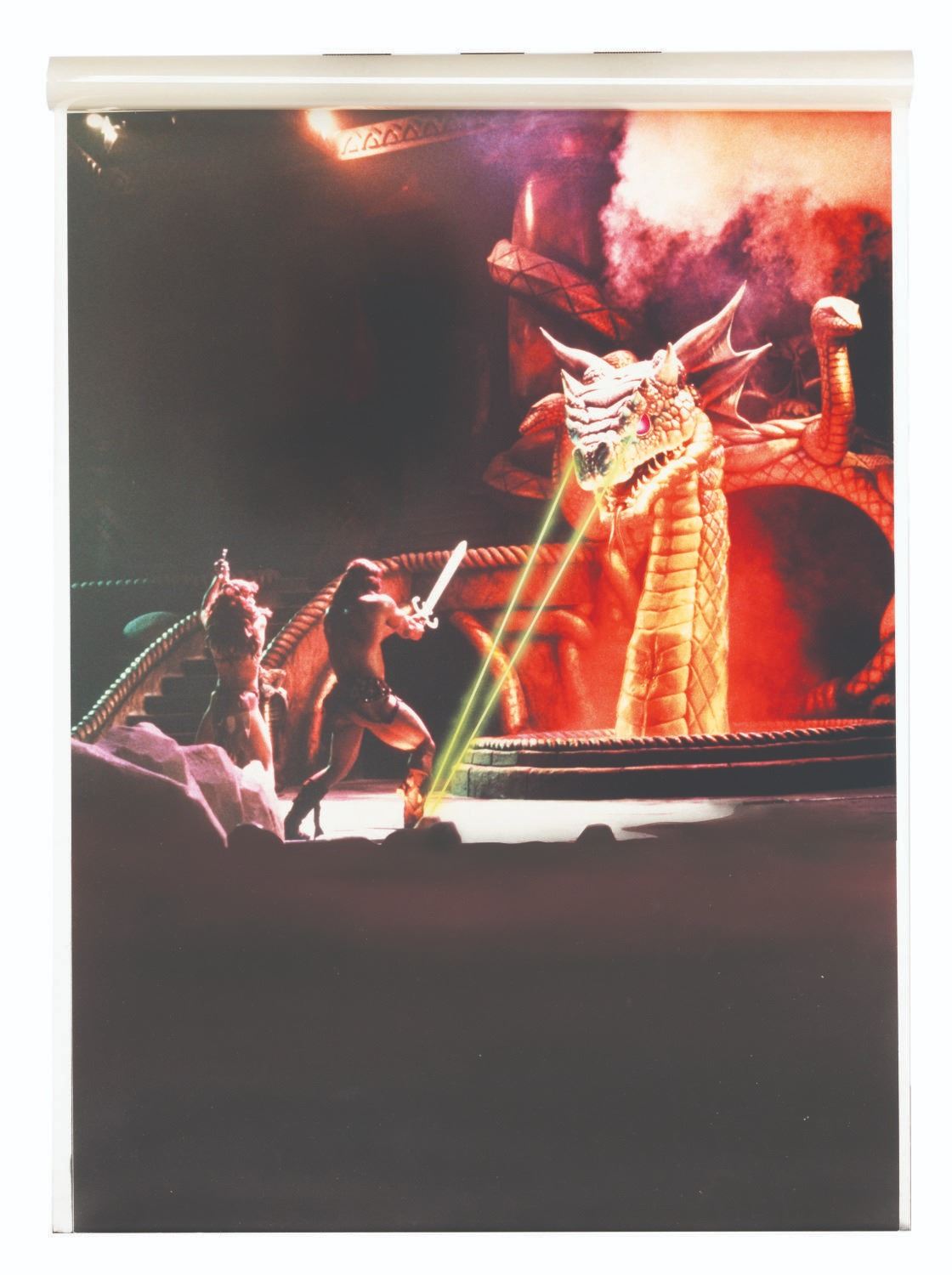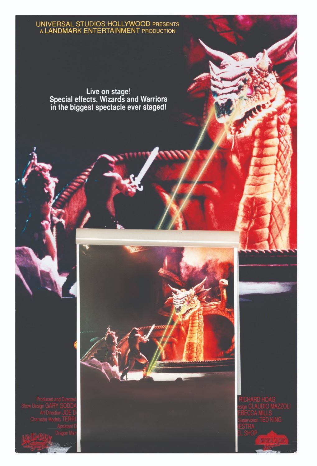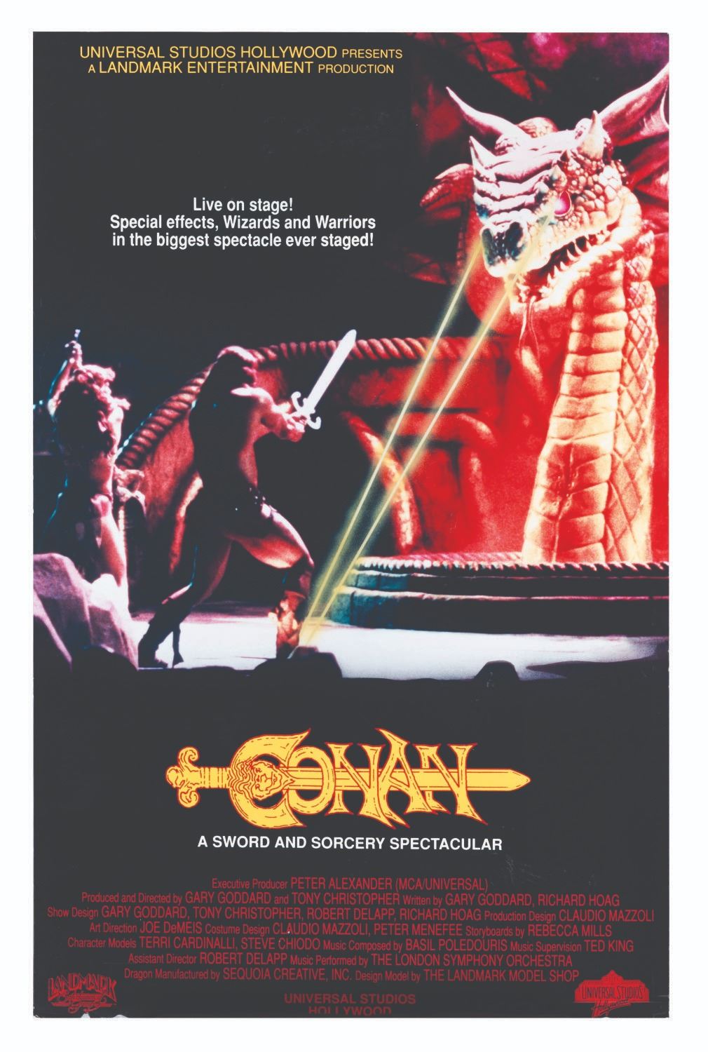 (Universal Studios, 1983) An attraction poster and airbrushed original poster artwork for The Adventures of Conan: A Sword and Sorcery Spectacular, at Universal Studios Hollywood. The poster depicts Conan and Red Sonja squaring off against a giant dragon. The artwork is the photograph airbrushed with energy beams from the dragon’s eyes, used to create the poster. Measuring 41"x26.5", the foamcore-mounted high-gloss poster is in good condition with typical wear from age and use including light edge-wear, surface scuffs, and lifting at the corners. The airbrush-enhanced poster artwork measures 15" x 20” and is in very good condition with very slight edge wear.