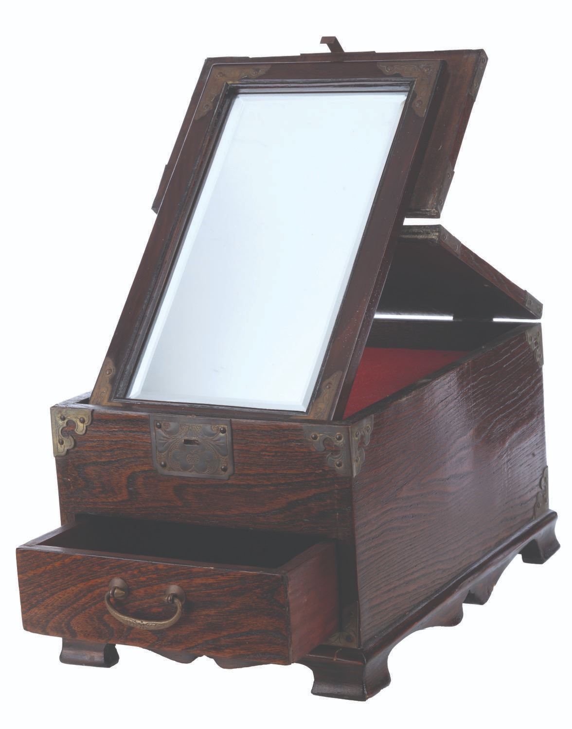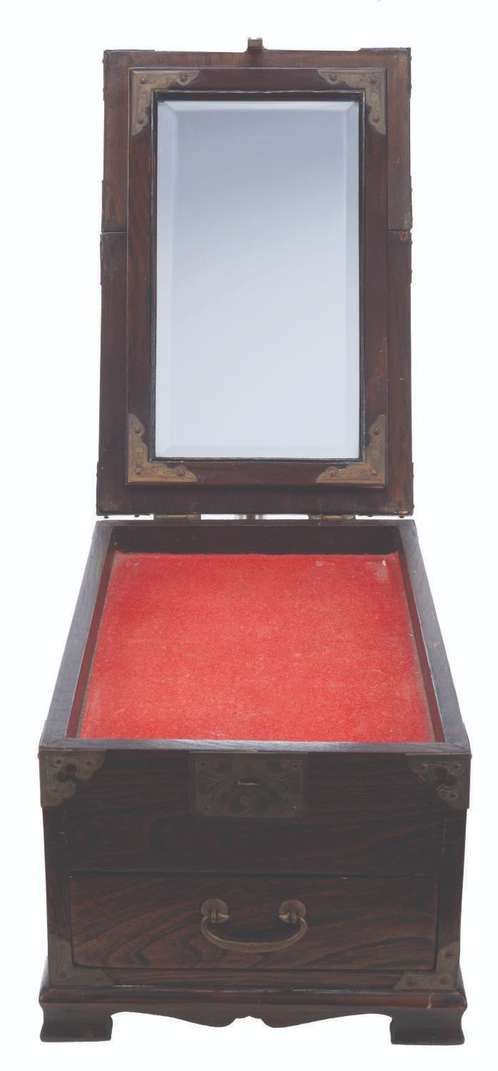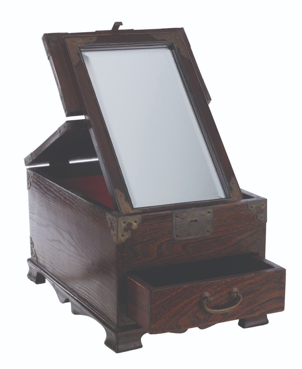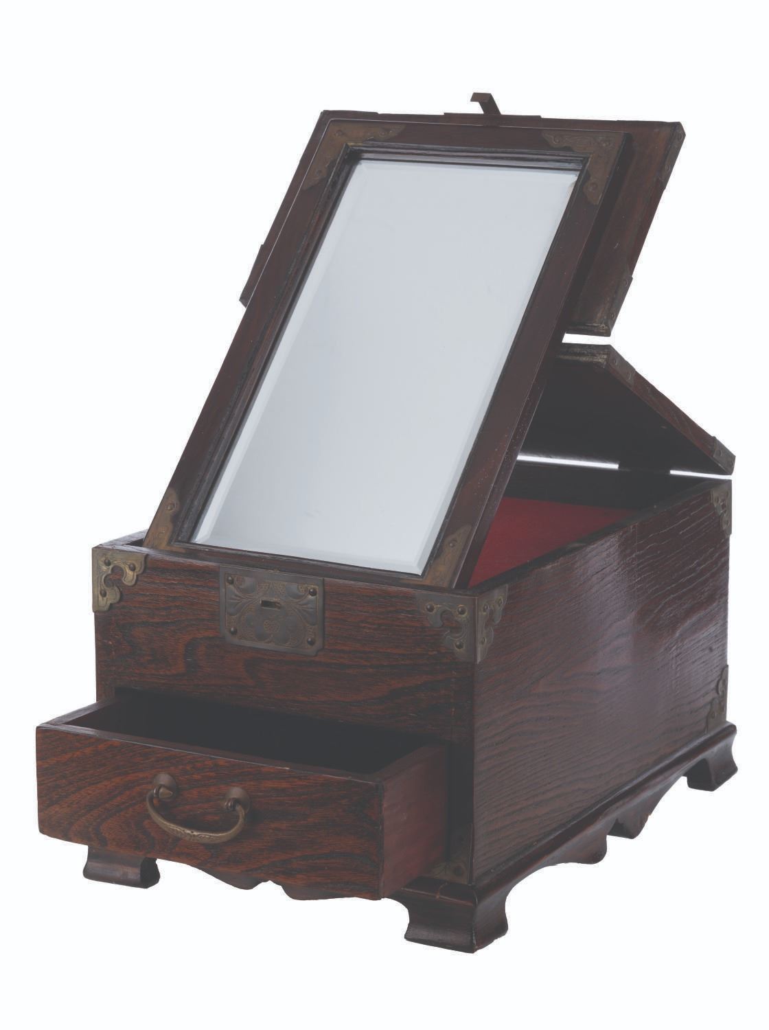 (Disney, 2003) A gorgeous wooden vanity prop for Elizabeth Swann's bedroom in "Pirates of the Caribbean: The Curse of the Black Pearl." Though this prop is not seen on screen, it is labeled in white marker on the bottom as "E. Swann Bedroom" and was used as set decoration in the film's early scenes. The vanity has a single drawer and a lid with a built-in mirror, which can be folded back for use or stored flat. Measuring 13" x 8.5" and 7.25" tall, the vanity is in very good condition with some scratches to the wood and metal fixtures, as well as general tarnish either from age or intentional distress.