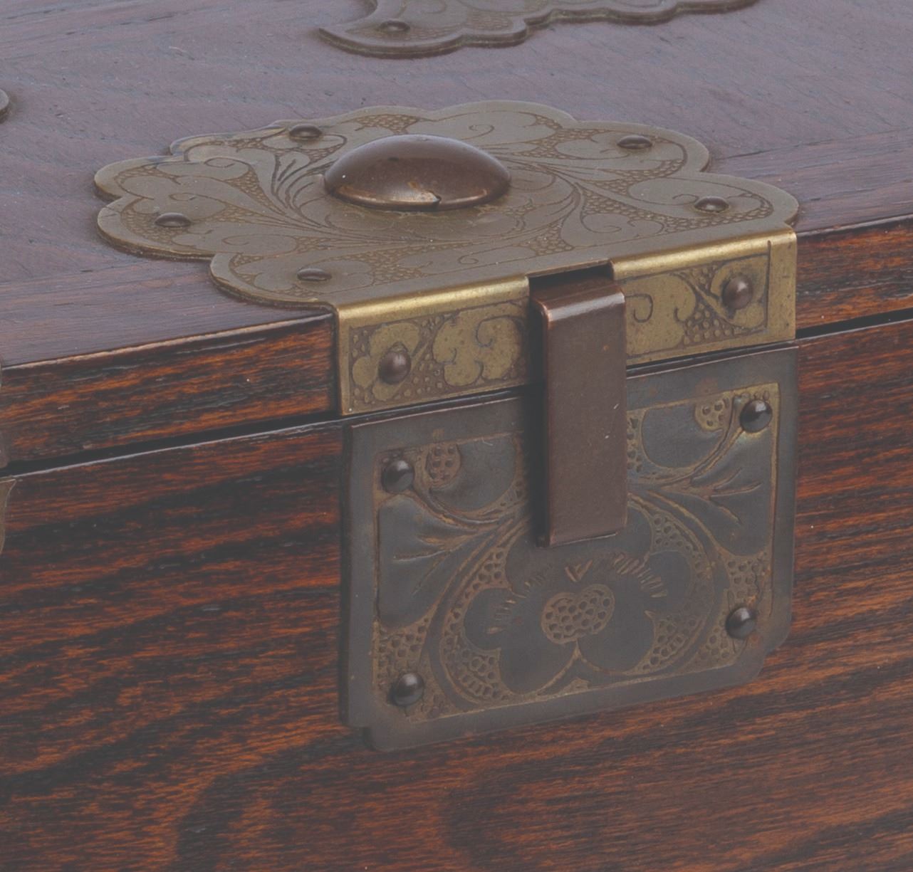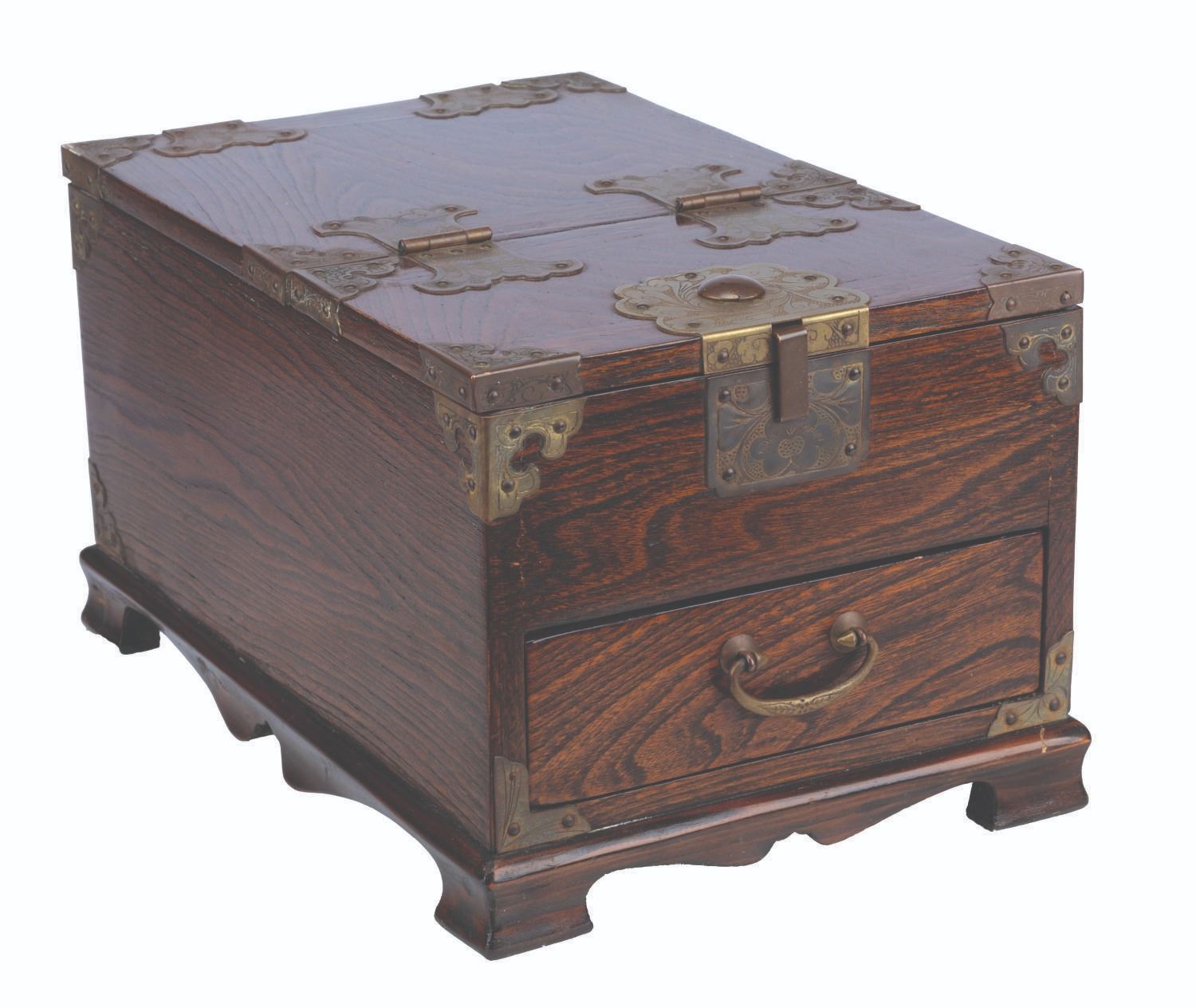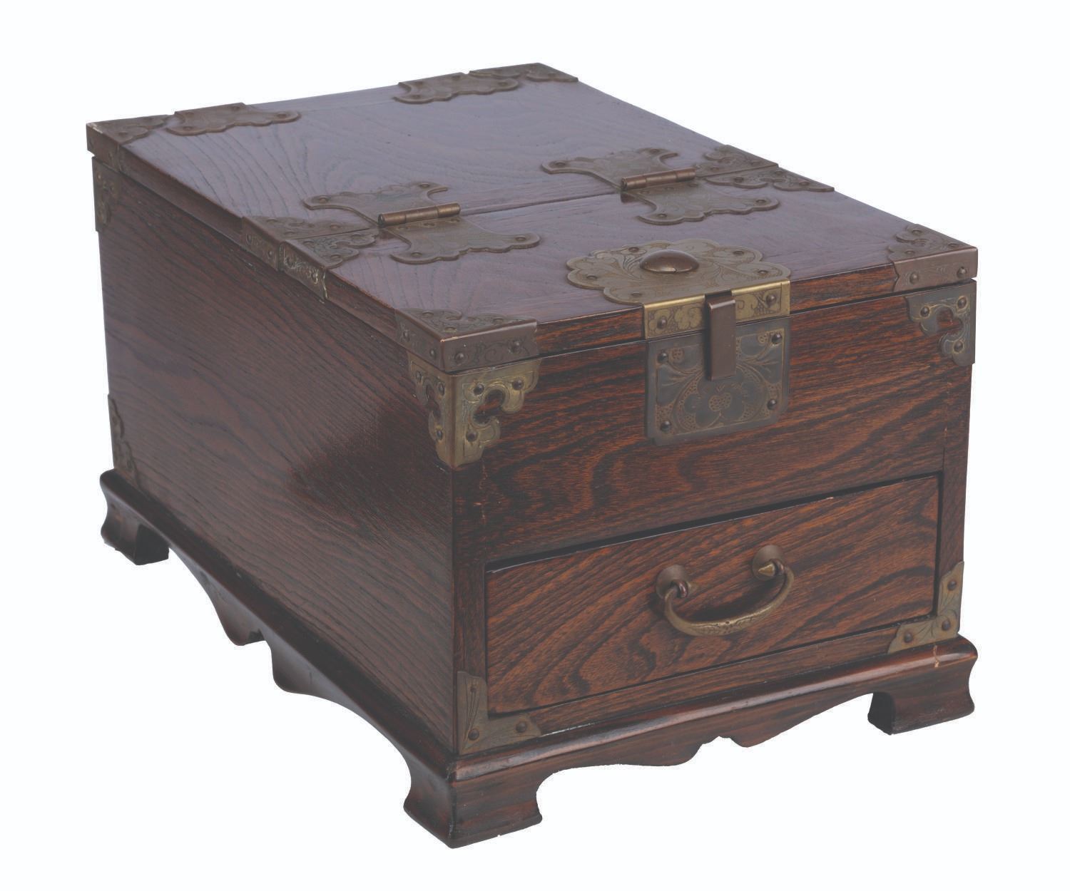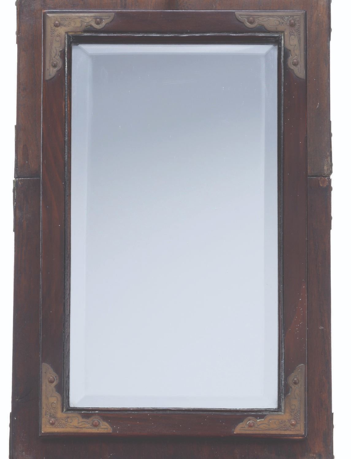 (Disney, 2003) A gorgeous wooden vanity prop for Elizabeth Swann's bedroom in "Pirates of the Caribbean: The Curse of the Black Pearl." Though this prop is not seen on screen, it is labeled in white marker on the bottom as "E. Swann Bedroom" and was used as set decoration in the film's early scenes. The vanity has a single drawer and a lid with a built-in mirror, which can be folded back for use or stored flat. Measuring 13" x 8.5" and 7.25" tall, the vanity is in very good condition with some scratches to the wood and metal fixtures, as well as general tarnish either from age or intentional distress.