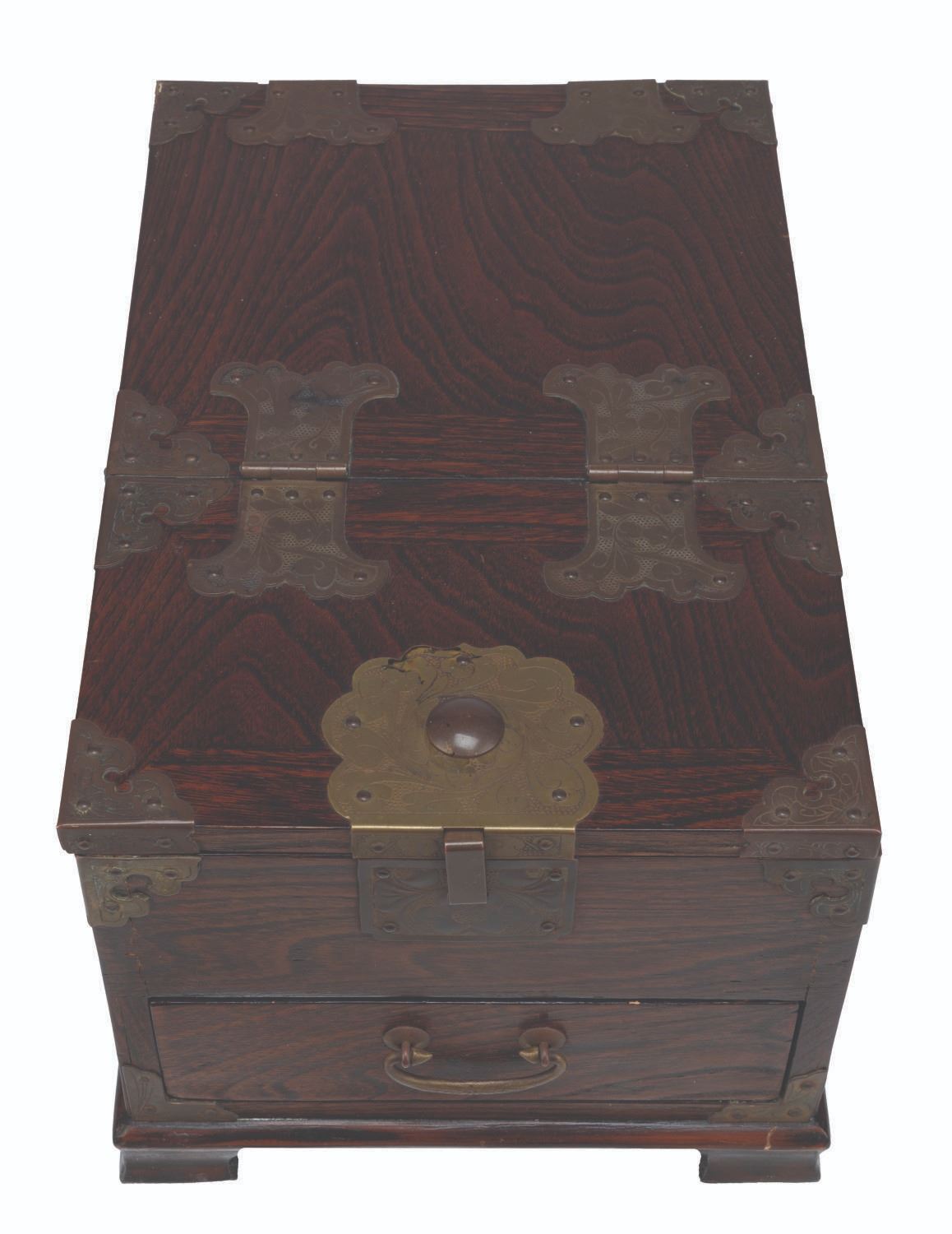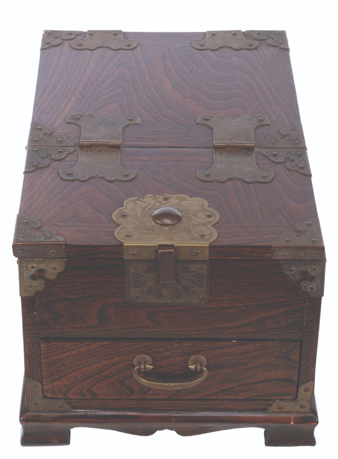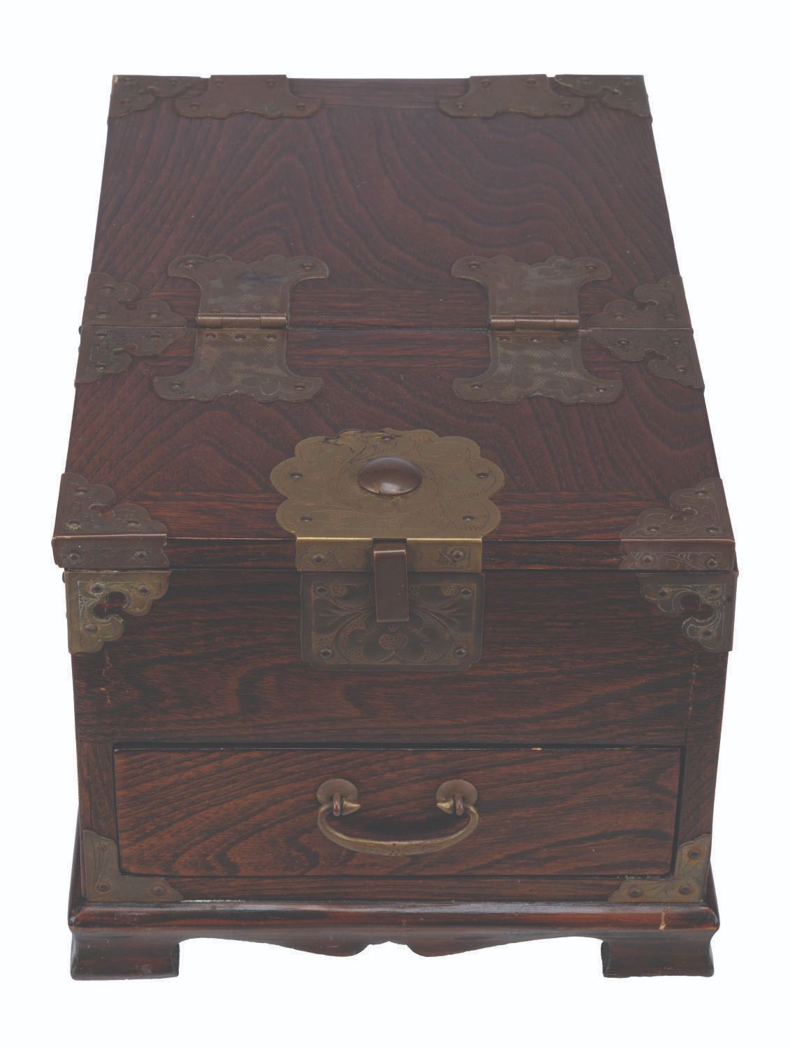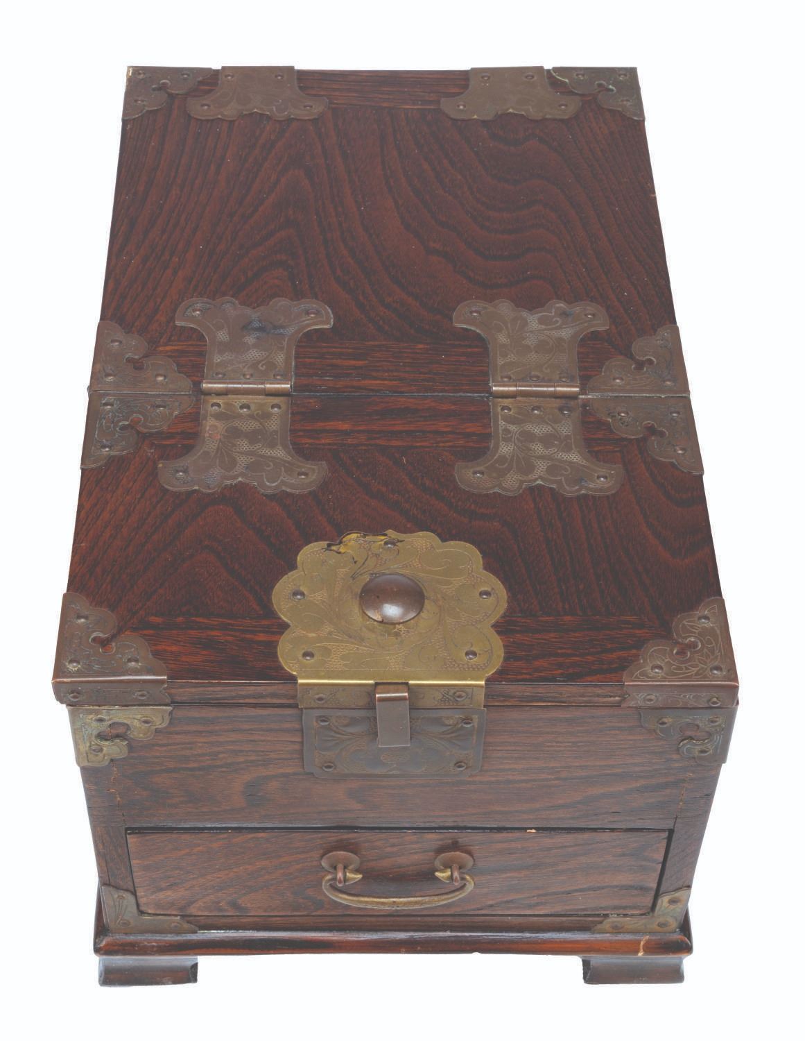 (Disney, 2003) A gorgeous wooden vanity prop for Elizabeth Swann's bedroom in "Pirates of the Caribbean: The Curse of the Black Pearl." Though this prop is not seen on screen, it is labeled in white marker on the bottom as "E. Swann Bedroom" and was used as set decoration in the film's early scenes. The vanity has a single drawer and a lid with a built-in mirror, which can be folded back for use or stored flat. Measuring 13" x 8.5" and 7.25" tall, the vanity is in very good condition with some scratches to the wood and metal fixtures, as well as general tarnish either from age or intentional distress.