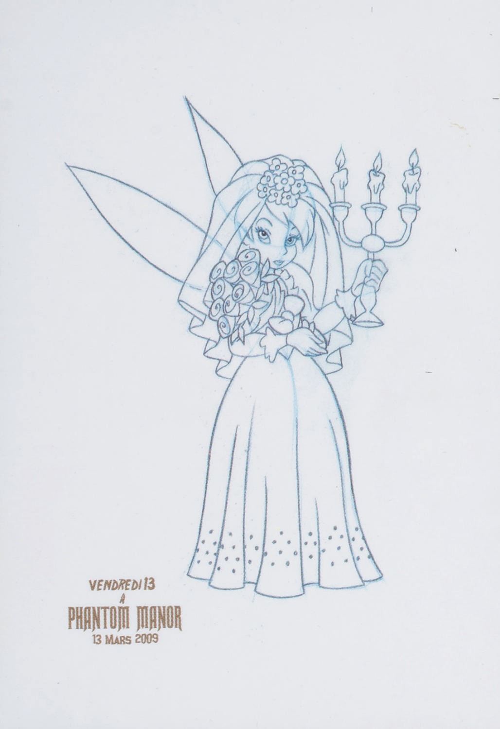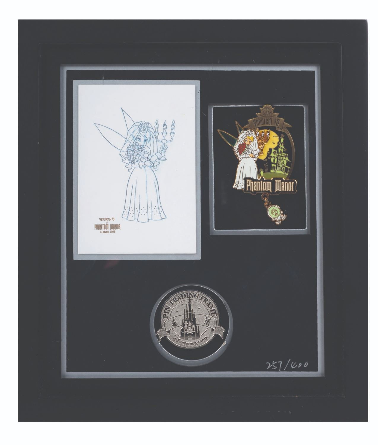 (Disneyland Paris, 2009) A Vendredi 13 à Phantom Manor pin released at a Disneyland Paris event, featuring Tinker Bell dressed as The Phantom Manor Bride with a dangling Madame Leota charm. Included are a commemorative medallion and concept art print, numbered 257/600, displayed together within a Pin Trading Frame. Measuring 3" x 2", the pin is in fine, as-new condition while the frame exhibits minor scuffs to plexiglass.