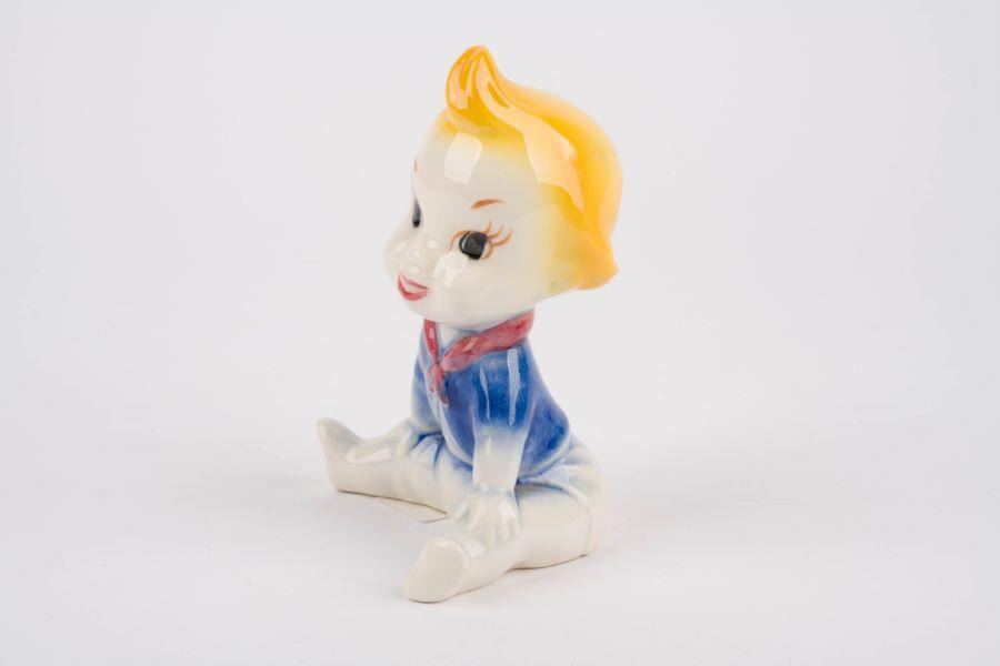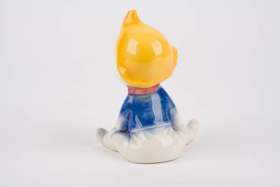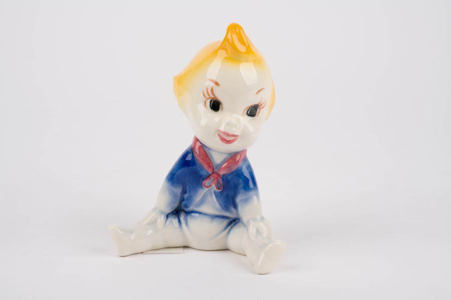 (Vernon Kilns, 1941) A ceramic Baby Weems figurine from "The Reluctant Dragon" manufactured by Vernon Kilns. Measuring 6" tall, the figurine is in very good condition with minor production imperfections in the glaze, light soiling, and adhesive residue from a previous label.
