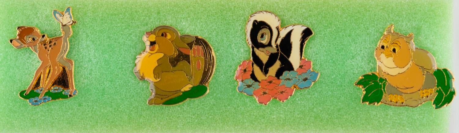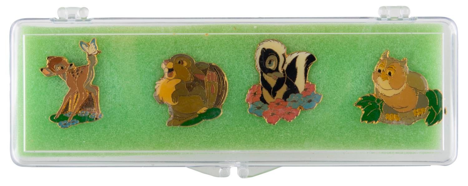 (Disney, 1987) A very early set of "Bambi" character pins featuring Bambi, Thumper, Flower, and Friend Owl. The set is in very good condition in the original box, with typical color shift to the epoxy-coated pins from age.