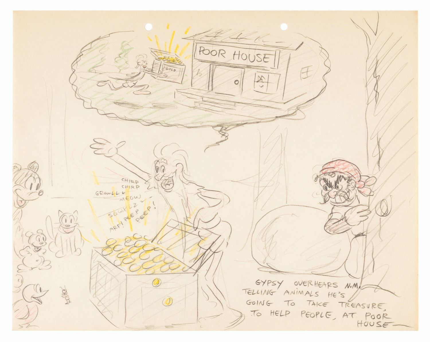 (Schlesinger, 1930s) An original story drawing from an unproduced Leon Schlesinger short. “Nature Man" tells his forest friends he plans to bring the gold to the poor house, while a gypsy spies on him. Measuring 9.5” x 12”, the graphite and colored pencil drawing is in very good condition with light edge wear and discoloration from age.