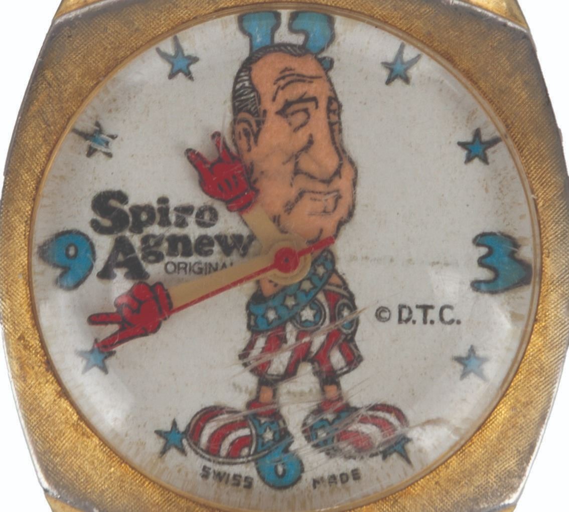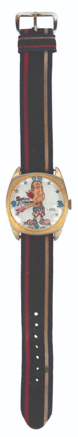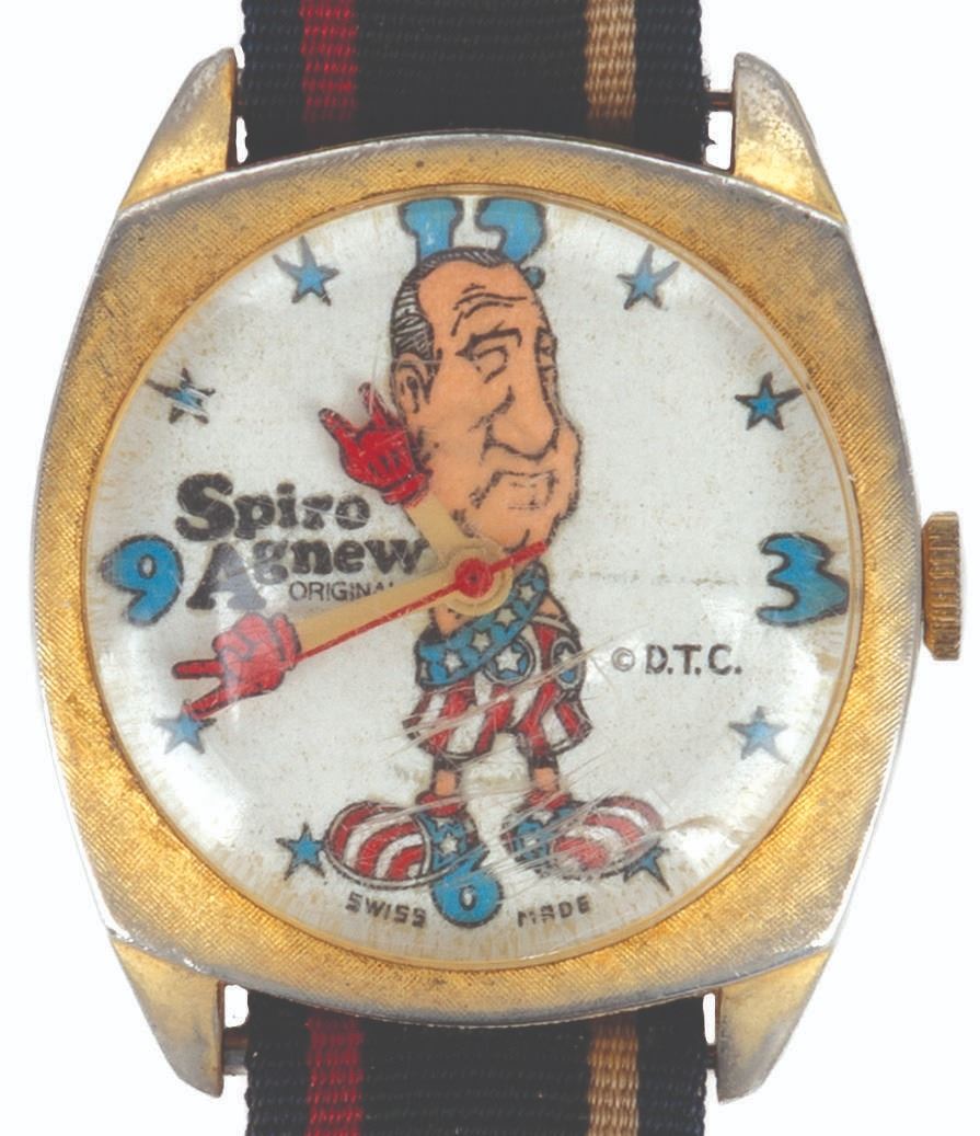(Dirty Time Company, 1970) A Spiro Agnew watch, in the style of the classic Mickey Mouse Ingersoll watches. These watches of Richard Nixon's Vice President were quite popular, with college students joking that Mickey Mouse wears a Spiro Agnew watch. Agnew eventually sued to try to prevent further sales of this watch. The watch did not function properly when tested, likely requiring repair to work correctly. Measuring 9" long, the watch displays in good condition with heavy surface scratches, oxidation from age, and wear.