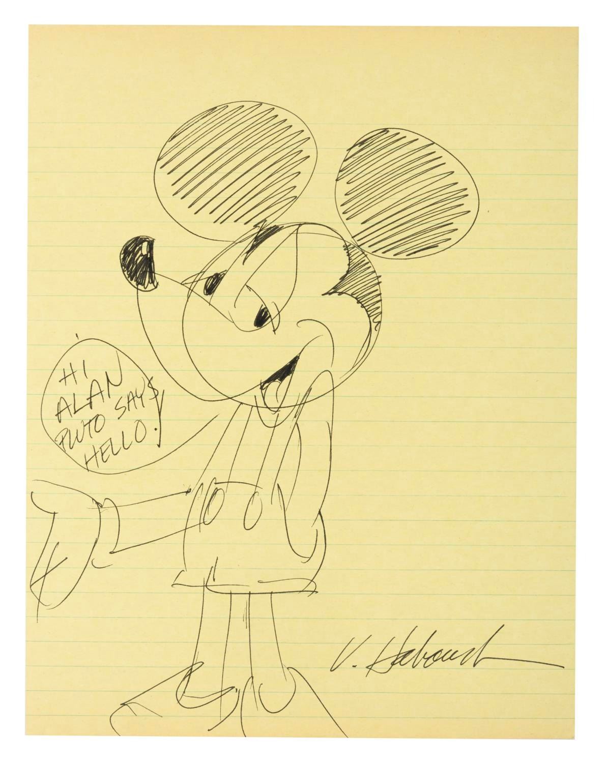 (Haboush, 1980s-2000s) A Mickey Mouse drawing by animator Victor Haboush, signed in black ink with a dedication. Haboush is known for his work on Disney films like “Peter Pan,” “The Lady and the Tramp,” and “Sleeping Beauty.” The 8.5” x 11” drawing accomplished in ink is in very good condition with light discoloration from age.