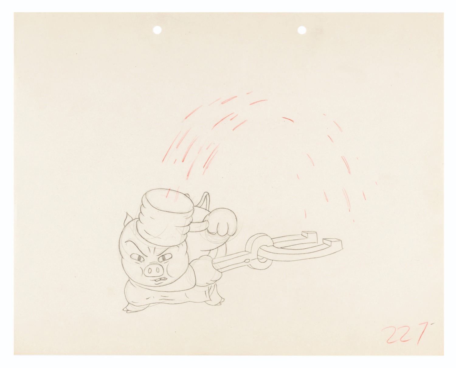 (Schlesinger, 1936) A production drawing of Porky Pig from “The Village Smithy.” With a character image size of 3.5” x 6” on 9.5” x 12” animation paper, the graphite and colored pencil drawing is in very good condition with light wear.