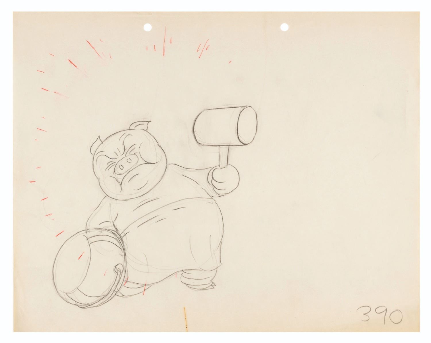 (Schlesinger, 1936) An original production drawing of Porky Pig from “The Village Smithy.” With a character image size of 6” x 6” on 9.5” x 12” animation paper, the graphite and colored pencil drawing is in good condition with scratches, creases, and discoloration from age.