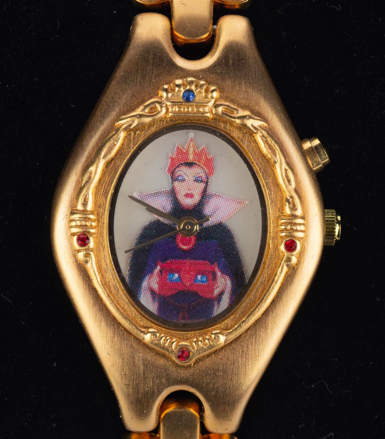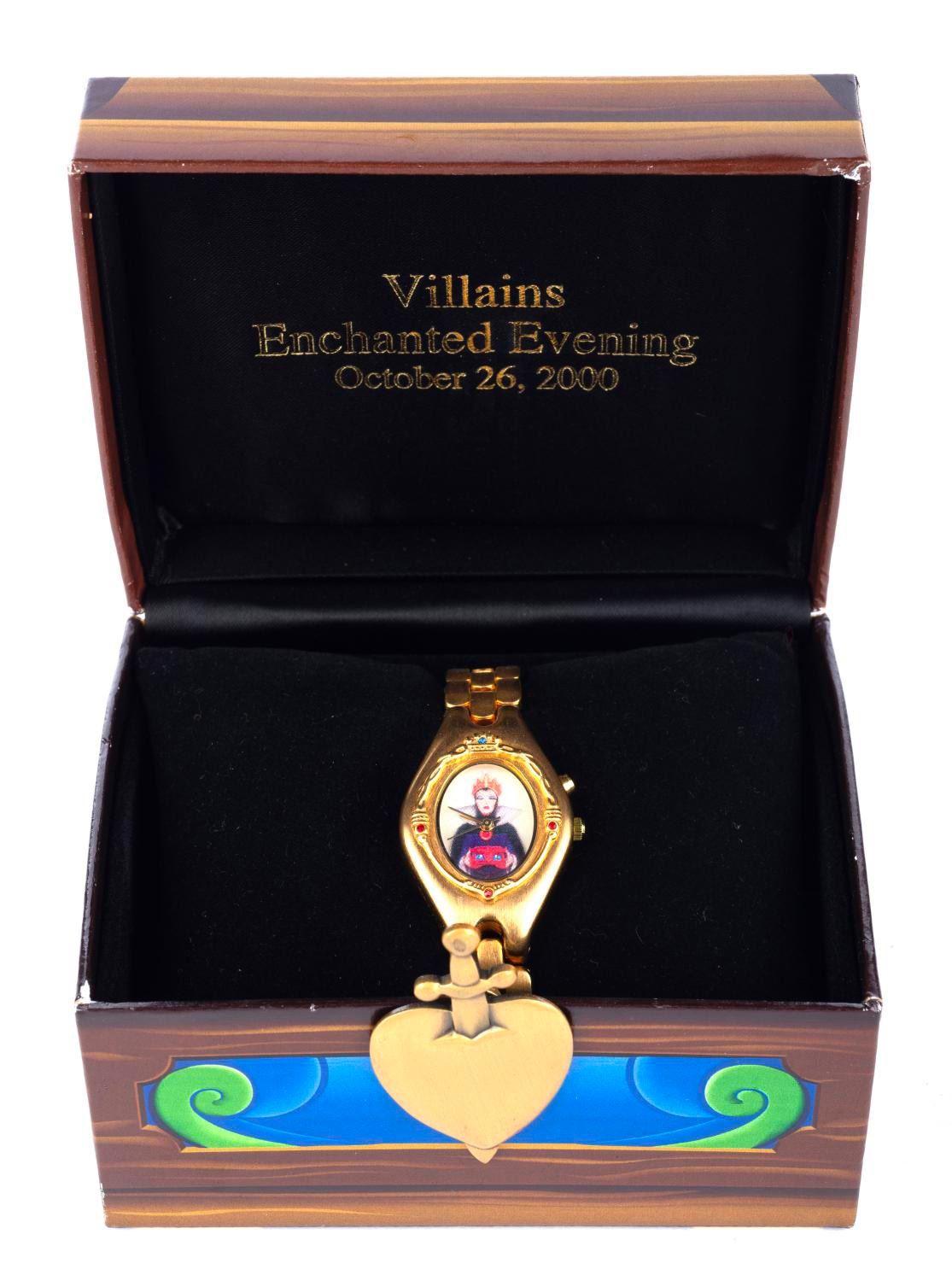 (Disney, 2000) An Evil Queen Watch & Pin created exclusively for the Villains Enchanted Evening on October 26, 2000. The watch and dagger and heart-shaped pin are in fine unused condition with original box.