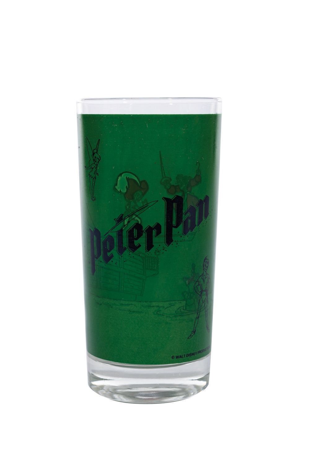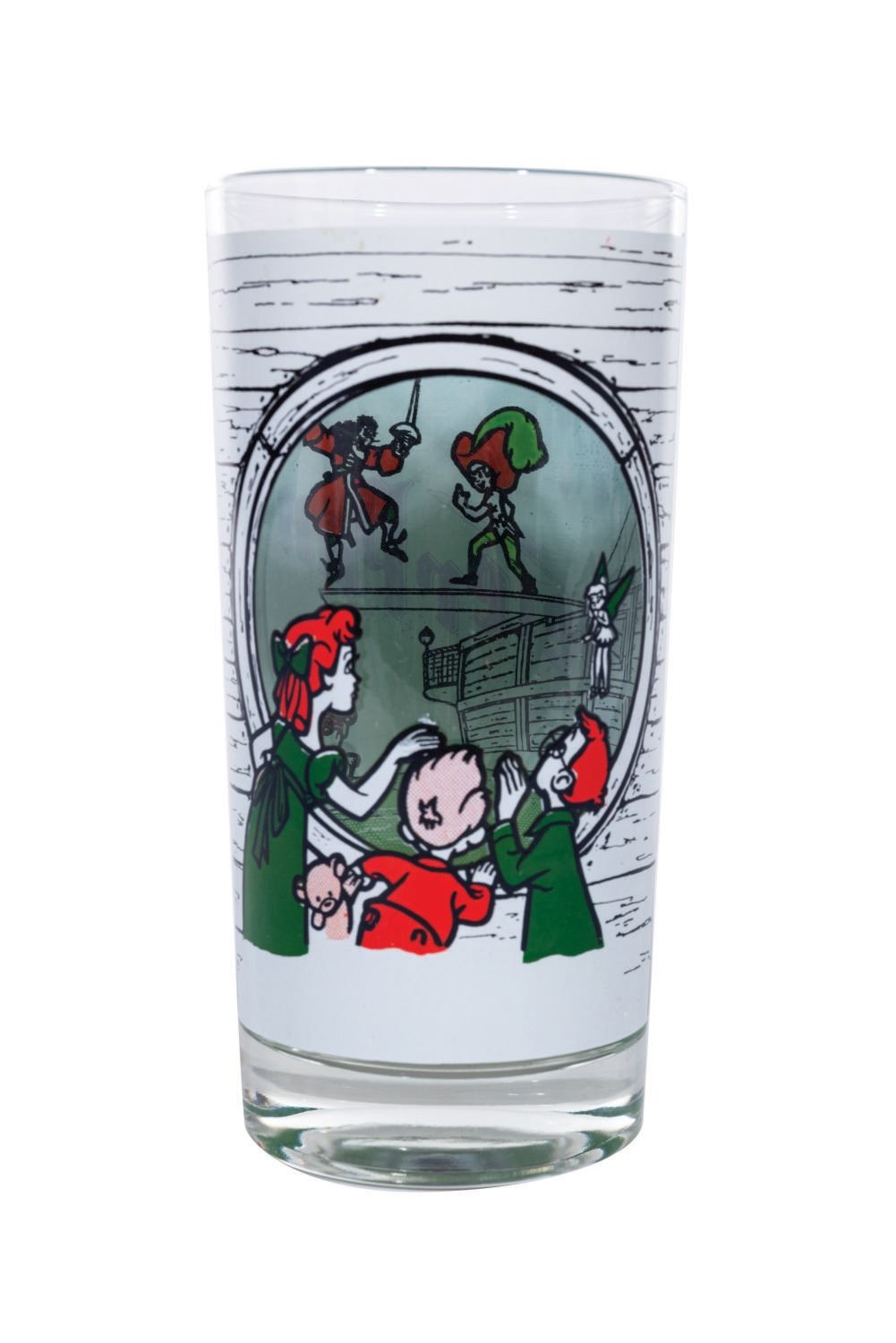 (Disney, c. 1960s) A very unusual drinking glass from Walt Disney's Peter Pan. The glass features imagery of Wendy, John, and Michael watching the epic battle between Captain Hook and Peter Pan through a porthole window of the Jolly Roger. Most likely a promotional or premium piece, the glass measures 5.75" tall and 2.75" in diameter and is in very good condition.