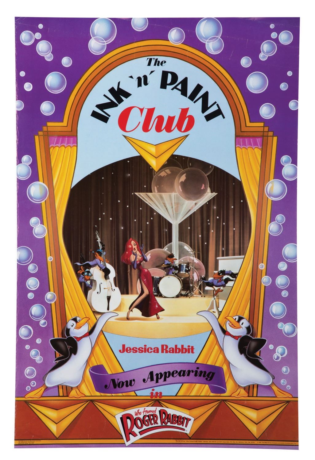 (Disney, 1987) A vintage Ink 'n' Paint Club Poster announcing Jessica Rabbit's appearance in Who Framed Roger Rabbit. Measuring 22.75"x35", the poster is in good condition with creases and wear to edges and corners throughout.