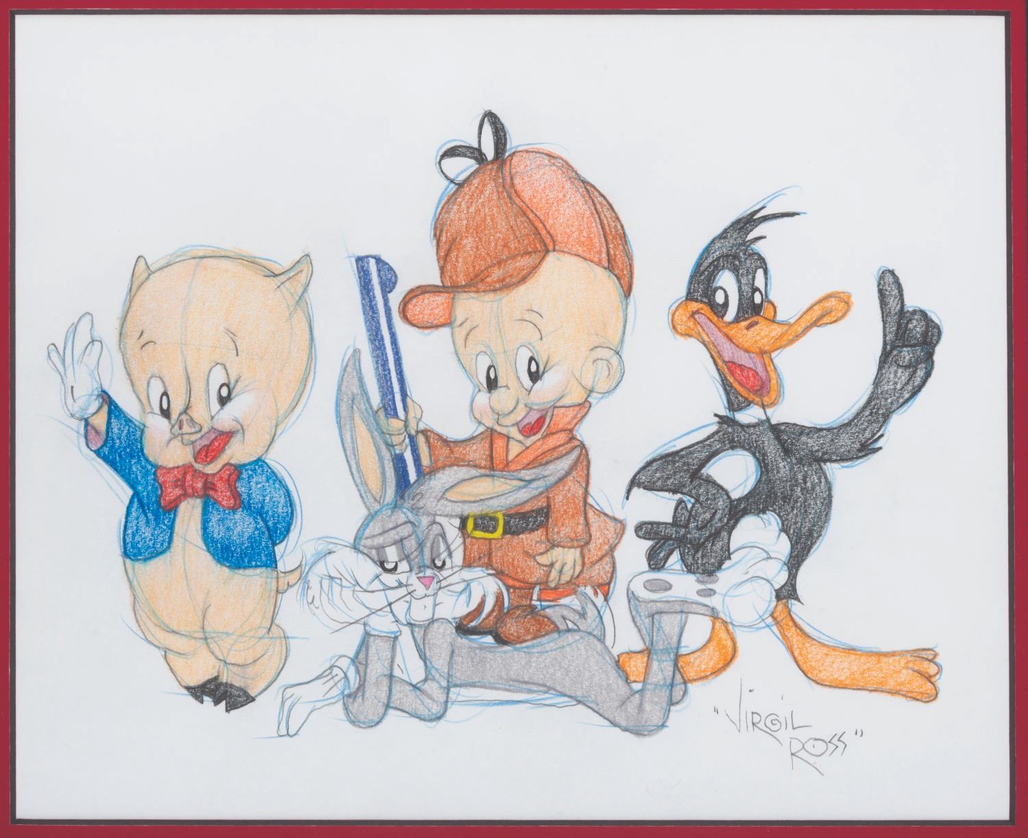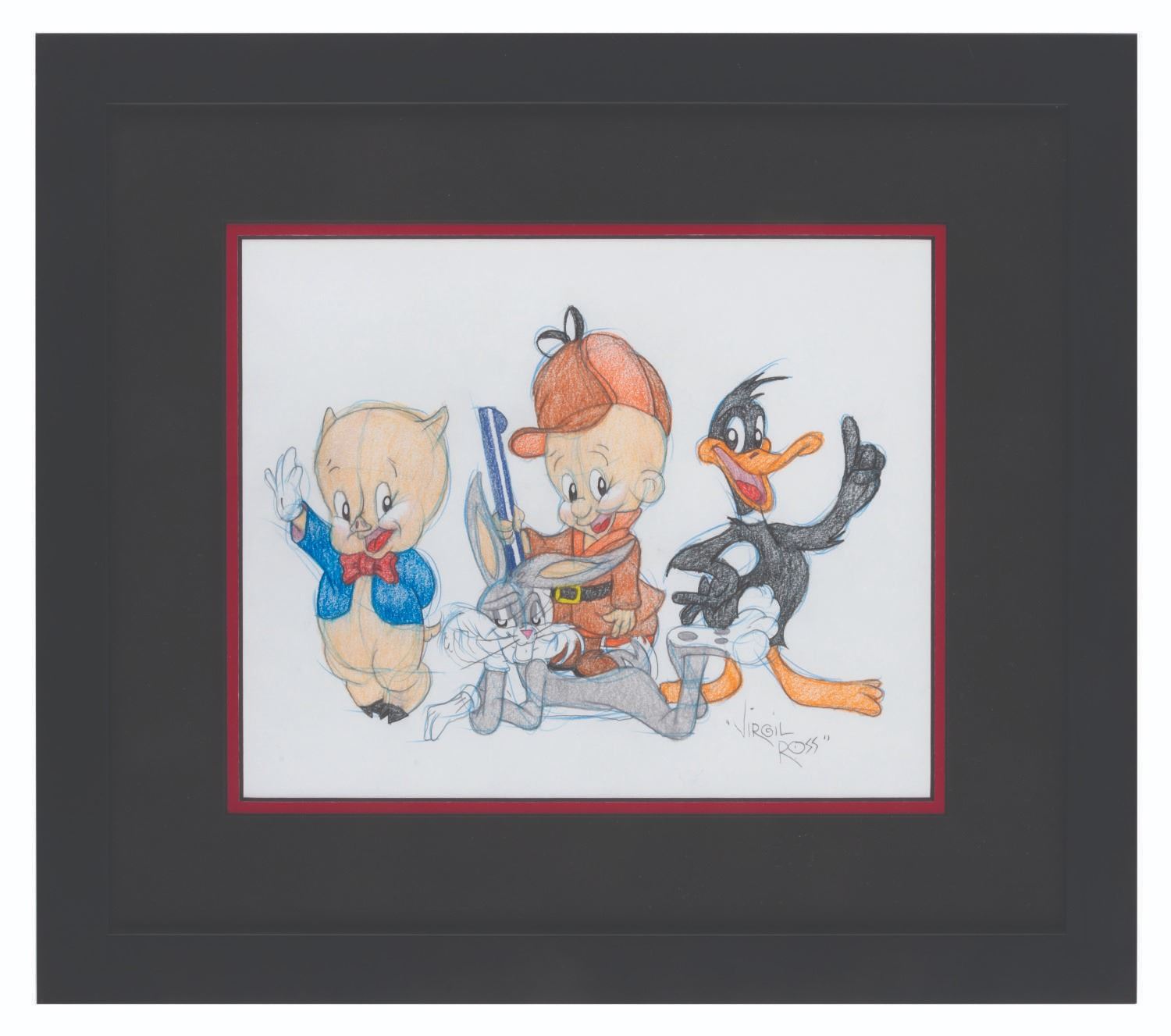 (Ross, 1990s) An original drawing of Bugs Bunny, Daffy Duck, Elmer Fudd, and Porky Pig signed by Virgil Ross. In the 1990s, Ross drew recreations of some of the most famous scenes he animated. With an image size of 7.5" x 11" and 17" x 19" framed and matted, the graphite and colored pencil drawing is in fine condition, while the frame is in very good condition with scratches and light wear.