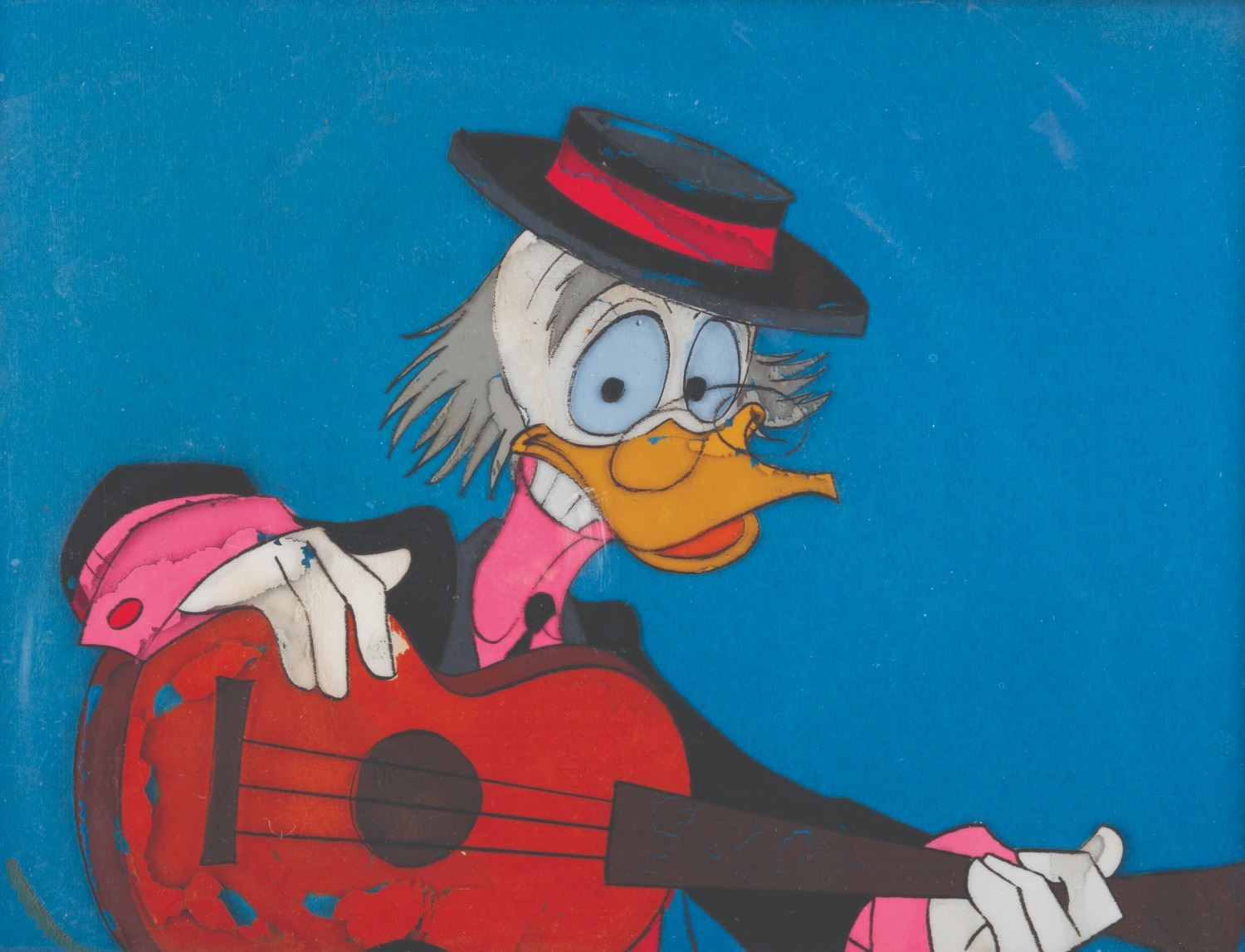 (Disney, 1962) An original production cel of Ludwig Von Drake from the "Walt Disney's Wonderful World of Color" episode "Von Drake in Spain," which aired April 8, 1962. This cel was sold at the Disneyland Art Corner, and comes with the original Art Corner gold label on the reverse of the matte. Ludwig has an image size of 5.5" x 7.75" on a 6.25" x 8.25" visible cel. The entire matted piece measures 10" x 12". The cel is in fair condition with heavy paint cracking, loss, transfer to the background, and edge wear to the matte.