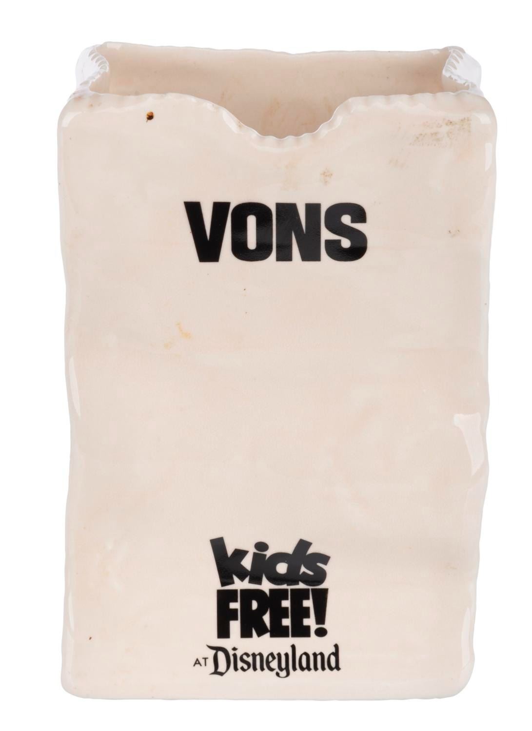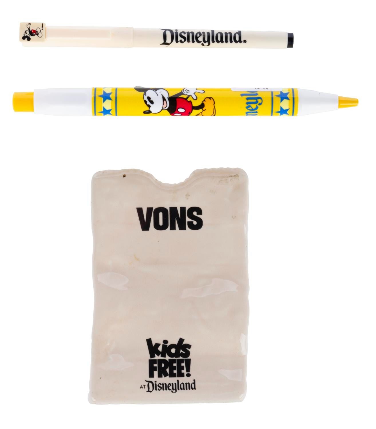 (Disneyland, 1990s) A Vons "Kids Free at Disneyland" pen holder. Shaped like a grocery bag, this piece commemorates the "Disneyland Kids Free" program at Vons Grocery outlets during the 1990s. This piece is accompanied by two souvenir Disneyland pens. Measuring 3.25"x2.75"x2.5", this ceramic is in good condition exhibiting scuffs and wear to the exterior and spots of discoloration inside. The pens measure 5.5" and 6.75" long and are in fair condition, requiring ink refills.