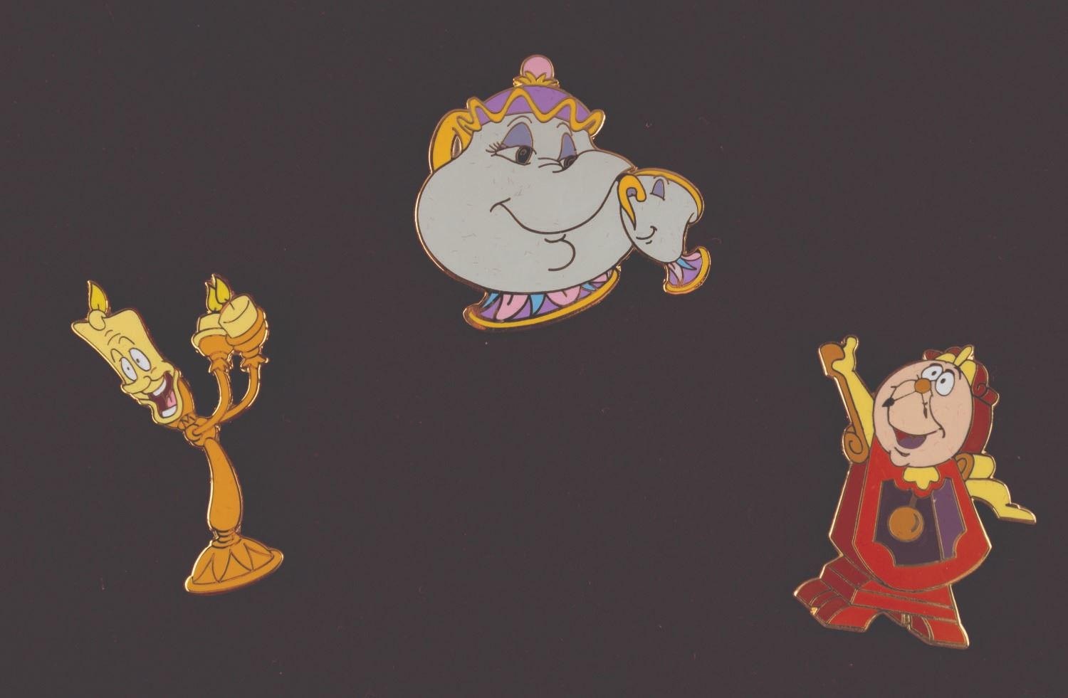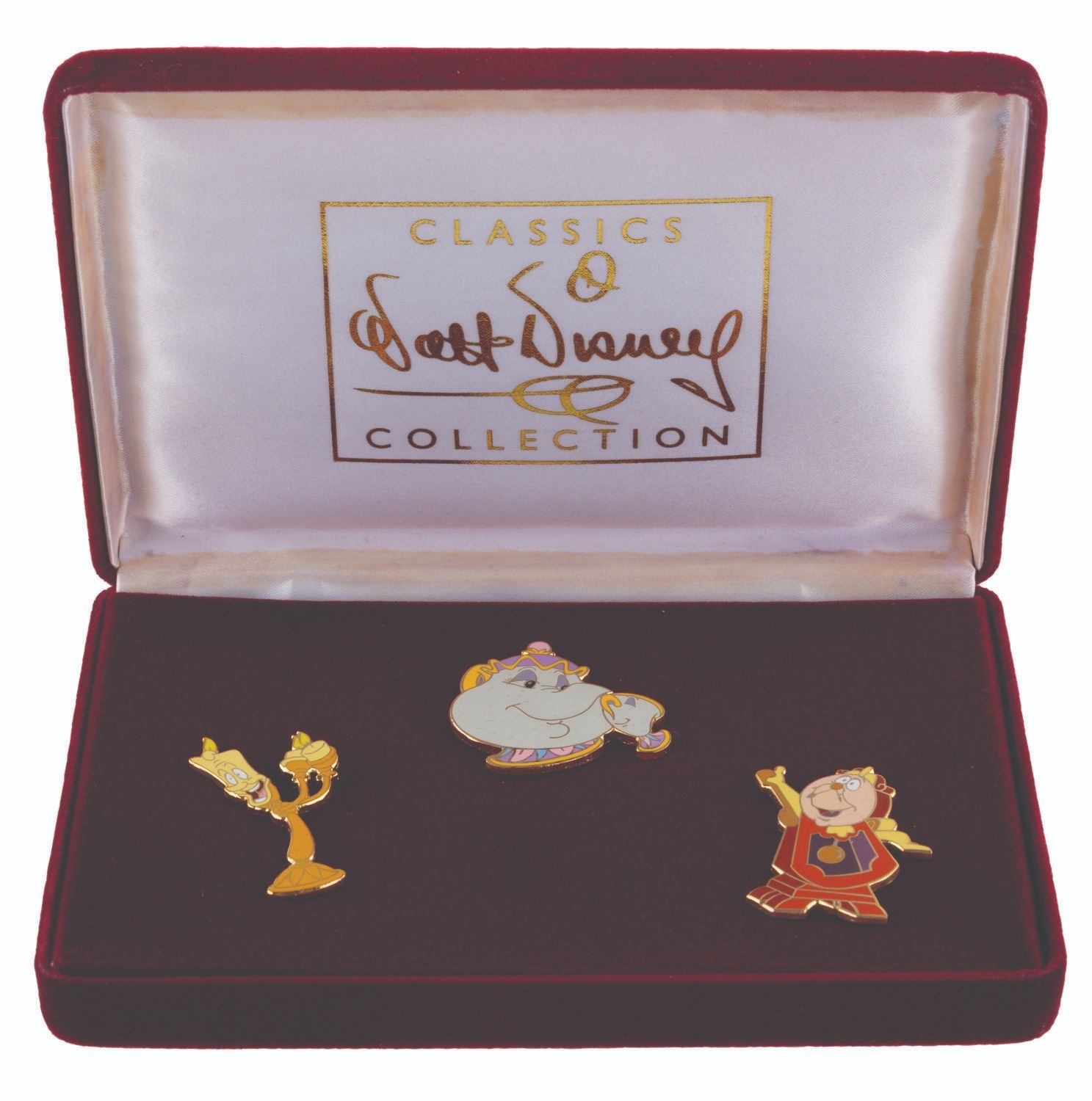 (WDCC, 2001) A Walt Disney Classics Collection three-pin set of Lumiere, Cogsworth, and Mrs. Potts with Chip from "Beauty and the Beast, " given as a gift with the purchase of the Belle "Dreaming of a Great Wide Somewhere " figurine. The pins come with their original box and are in fine condition.