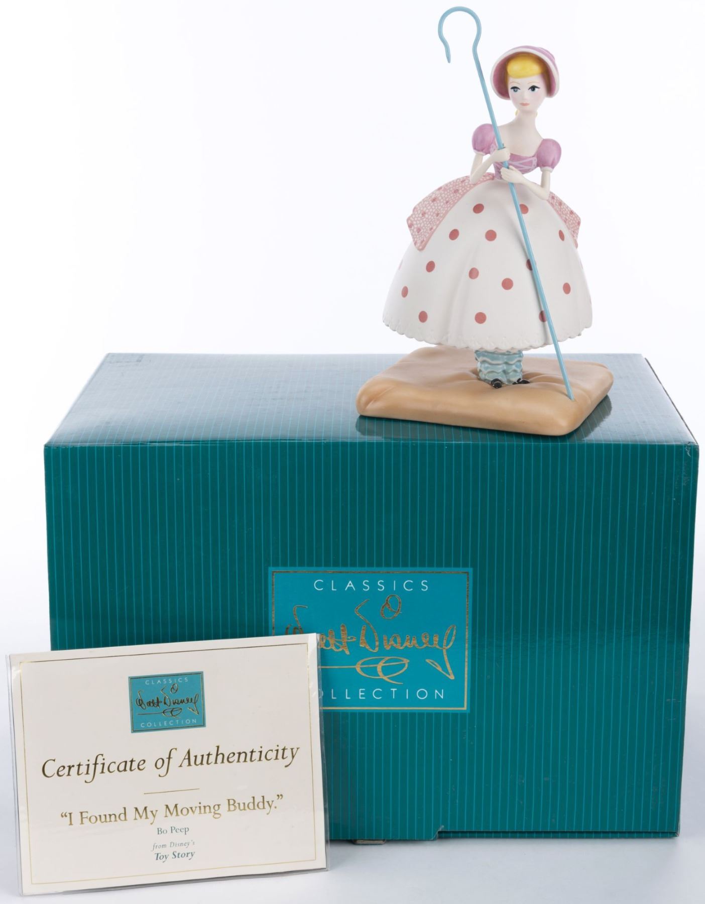 (WDCC, 1998) A Walt Disney Classics Collection figurine of Bo Peep from Pixar’s “Toy Story." Titled “I Found My Moving Buddy," the figurine was sculpted by Blaise Gauba and released in 1998. Measuring 4" x 4" and 7.25" tall, the figurine is in fine condition and comes with the original 11.5" x 7.5" x 7.5" box.