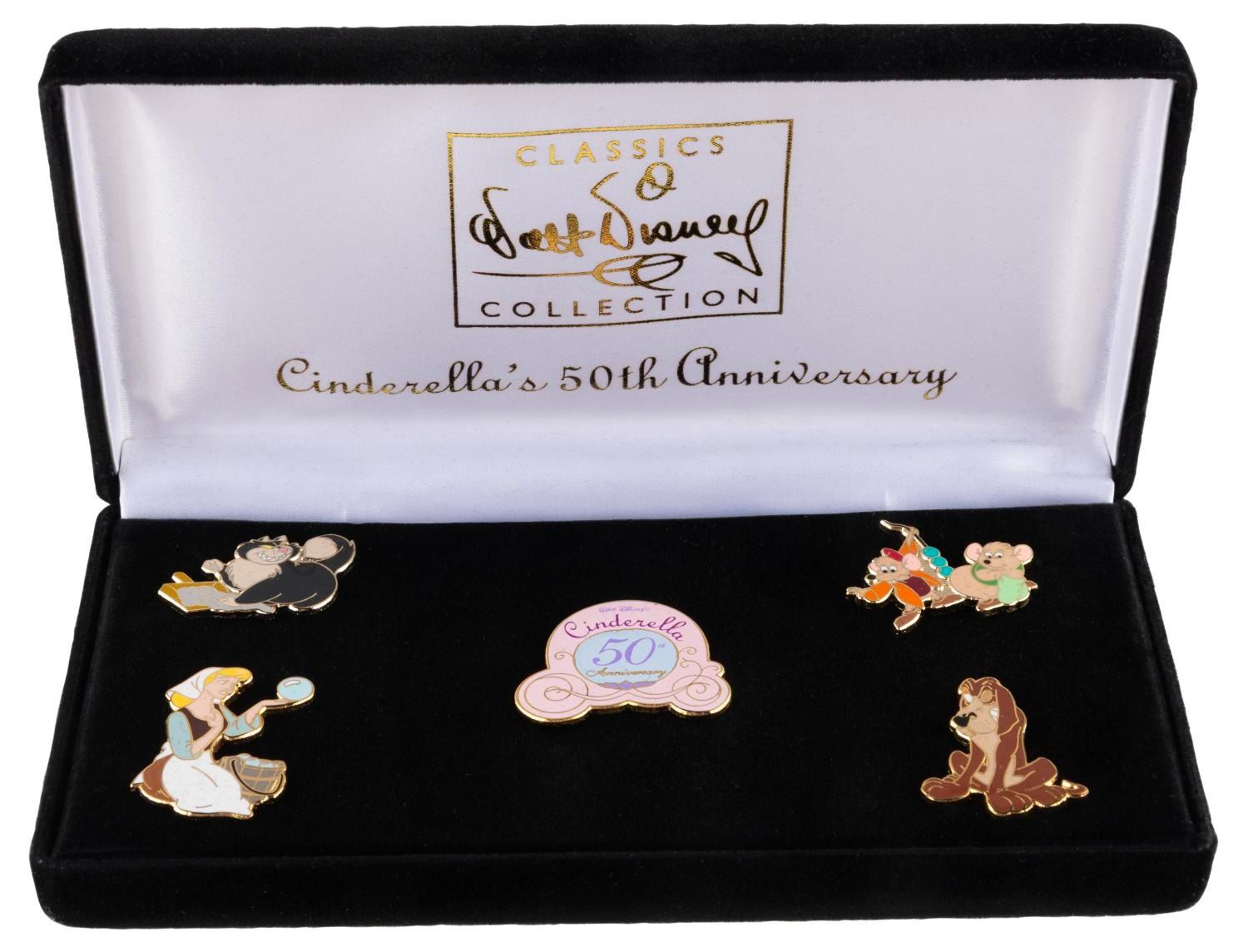 (WDCC, 2000) A Walt Disney Classics Collection set of five "Cinderella" pins, given as a gift with purchase of a sculpture for the film's 50th anniversary celebration. Included are Cinderella, Lucifer, Jaq, Gus Gus, Bruno, and an anniversary logo on the iconic pumpkin carriage. The set comes with its original box and is in very good condition with light wear.