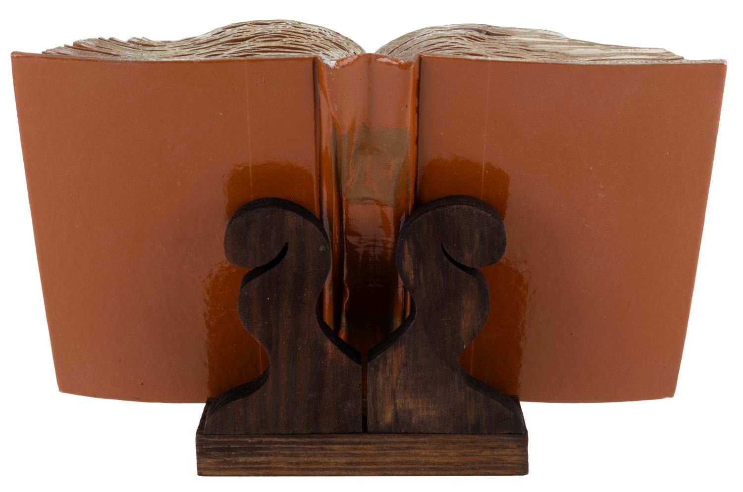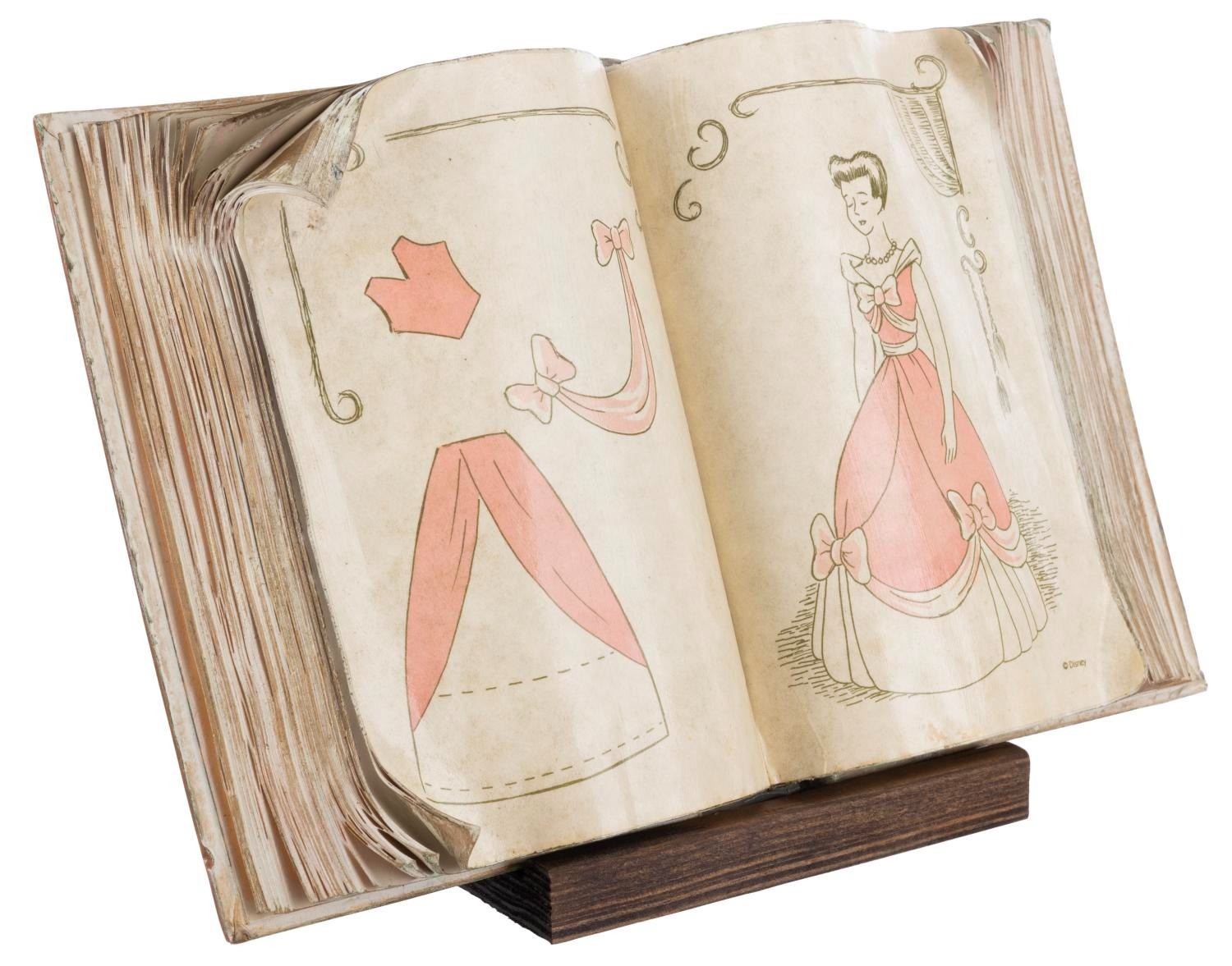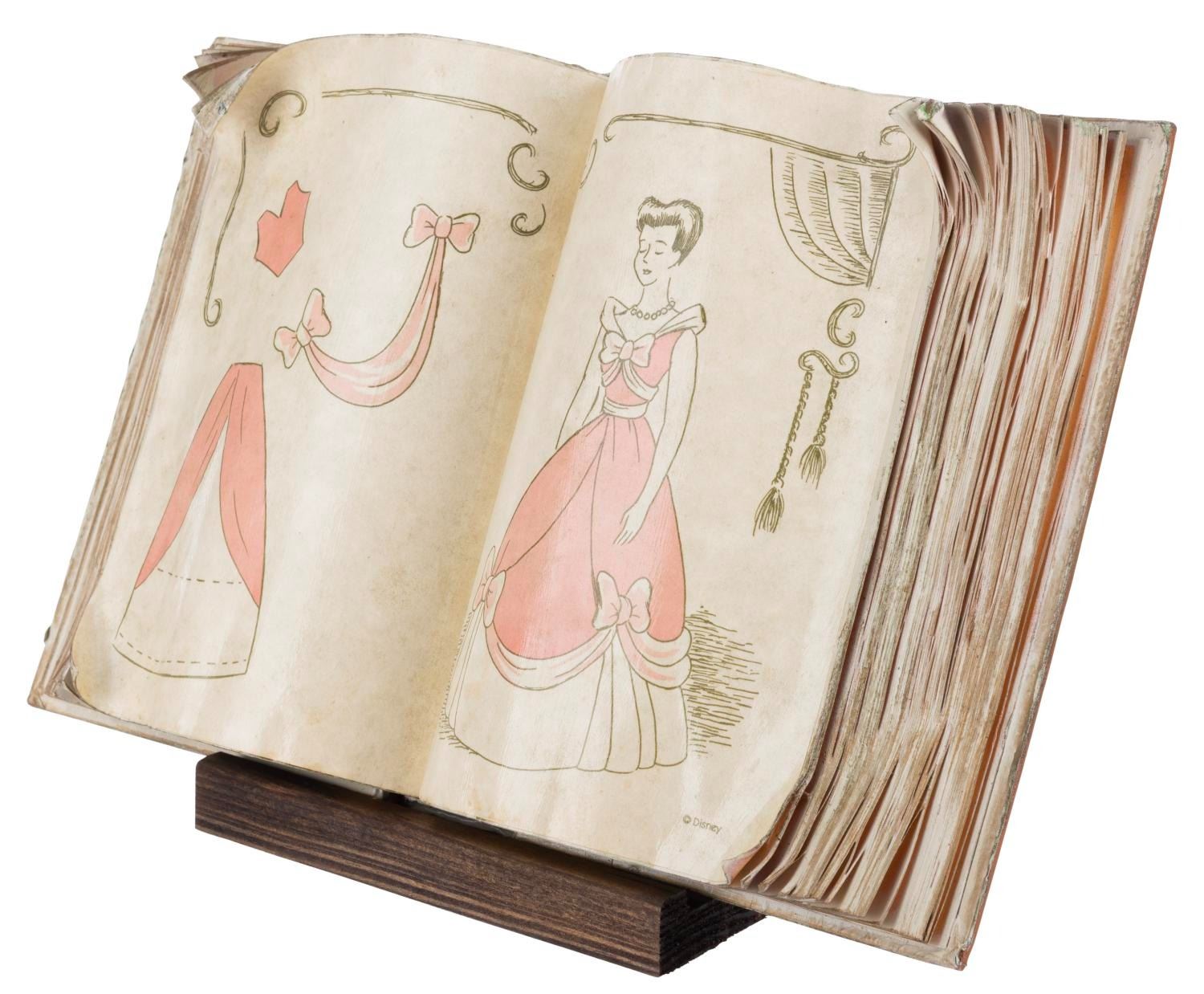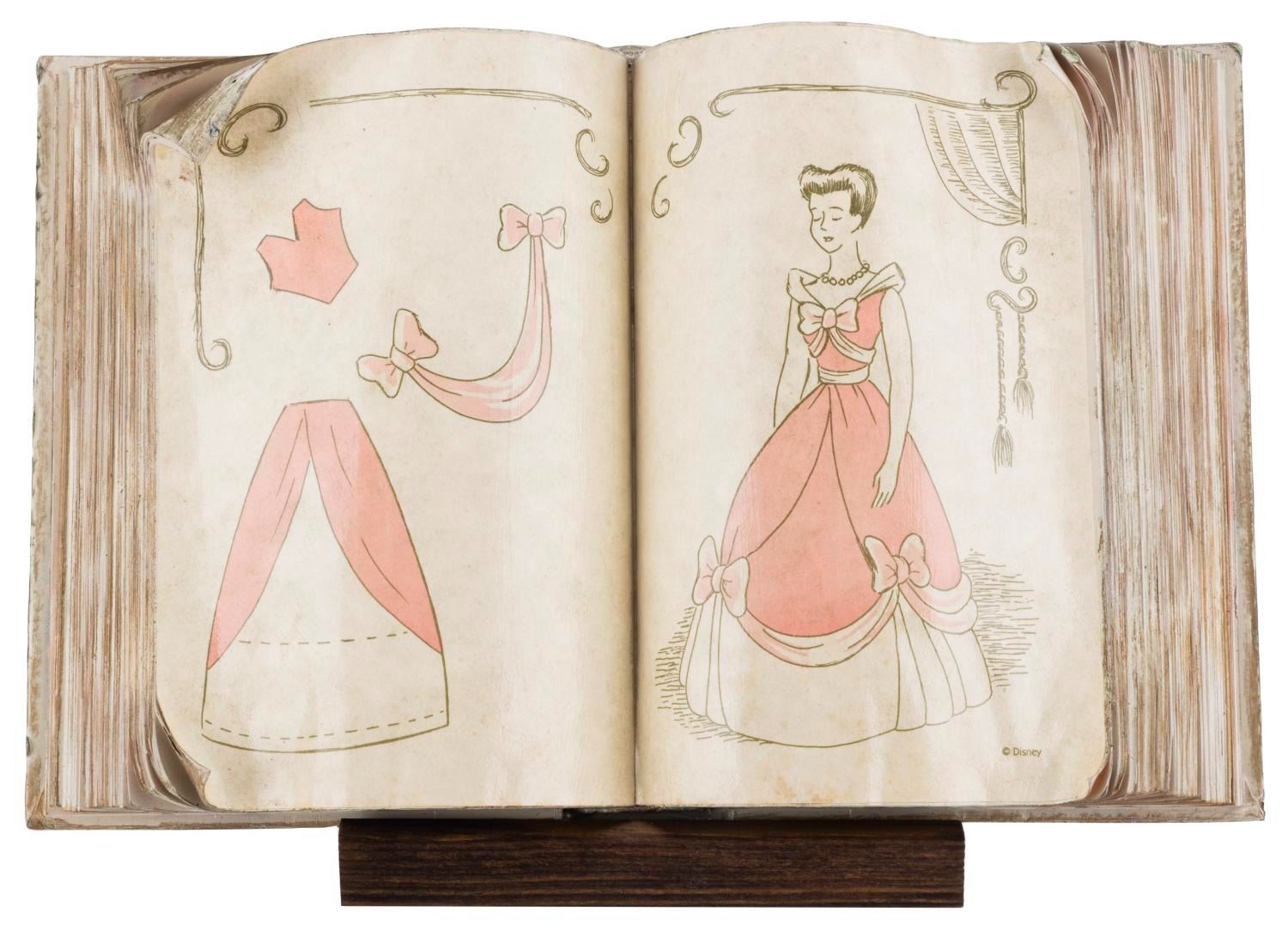 (WDCC, 1994) A Walt Disney Classics Collection dealer display titled "Cinderella’s Sewing Book." The unique piece was created using an actual book, involving six different processes, four of which were done by hand. The piece comes with a wooden display stand and the original box. Measuring 8" x 12" x 1.75", the display piece is in very good, intentionally distressed condition.