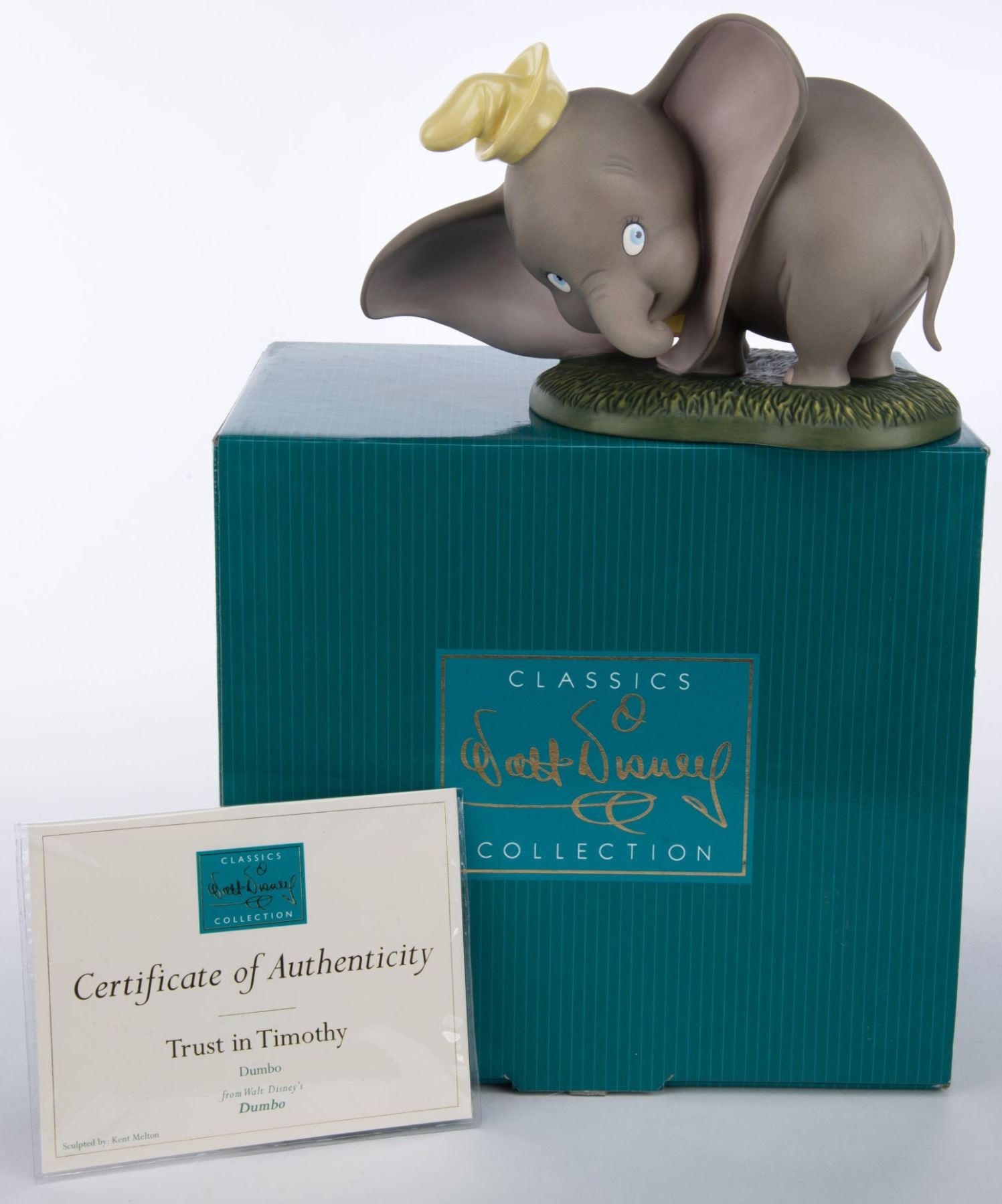 (WDCC, 2003) A Walt Disney Classics Collection figurine of Dumbo sculpted by Kent Melton and titled “Trust Timothy." Measuring 7.75" x 4.25" and 5.25" tall, the figurine is in fine condition and comes with the original 9.5" x 8.75" x 7" box and COA.