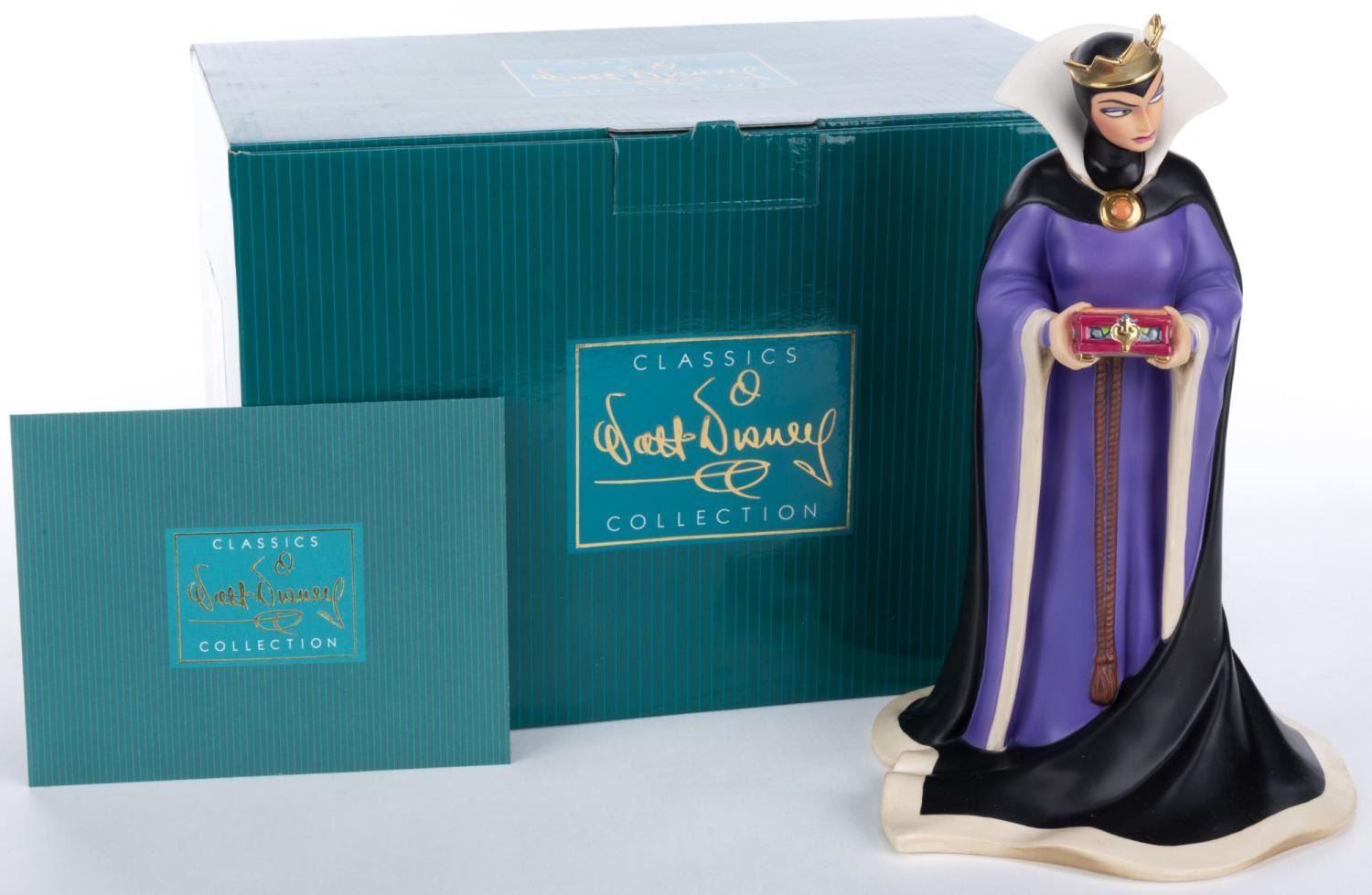 (WDCC, 1997) A Walt Disney Classics Collection “Bring Back Her Heart” figurine of the Evil Queen, sculpted by Kent Melton, released as the 1997 Spring Sculpture Event piece. Measuring 6” x 6.25” and 9” tall, the figurine is in fine condition and comes with the original box and COA.