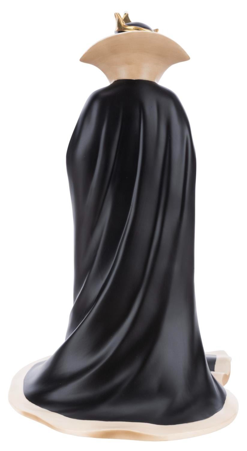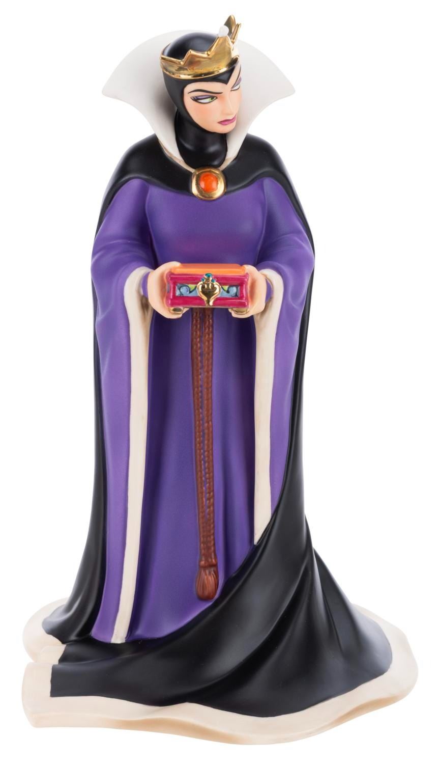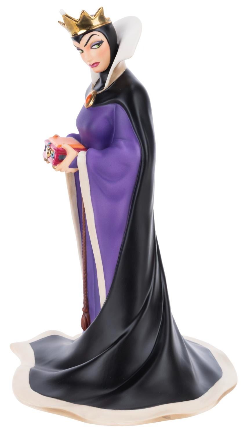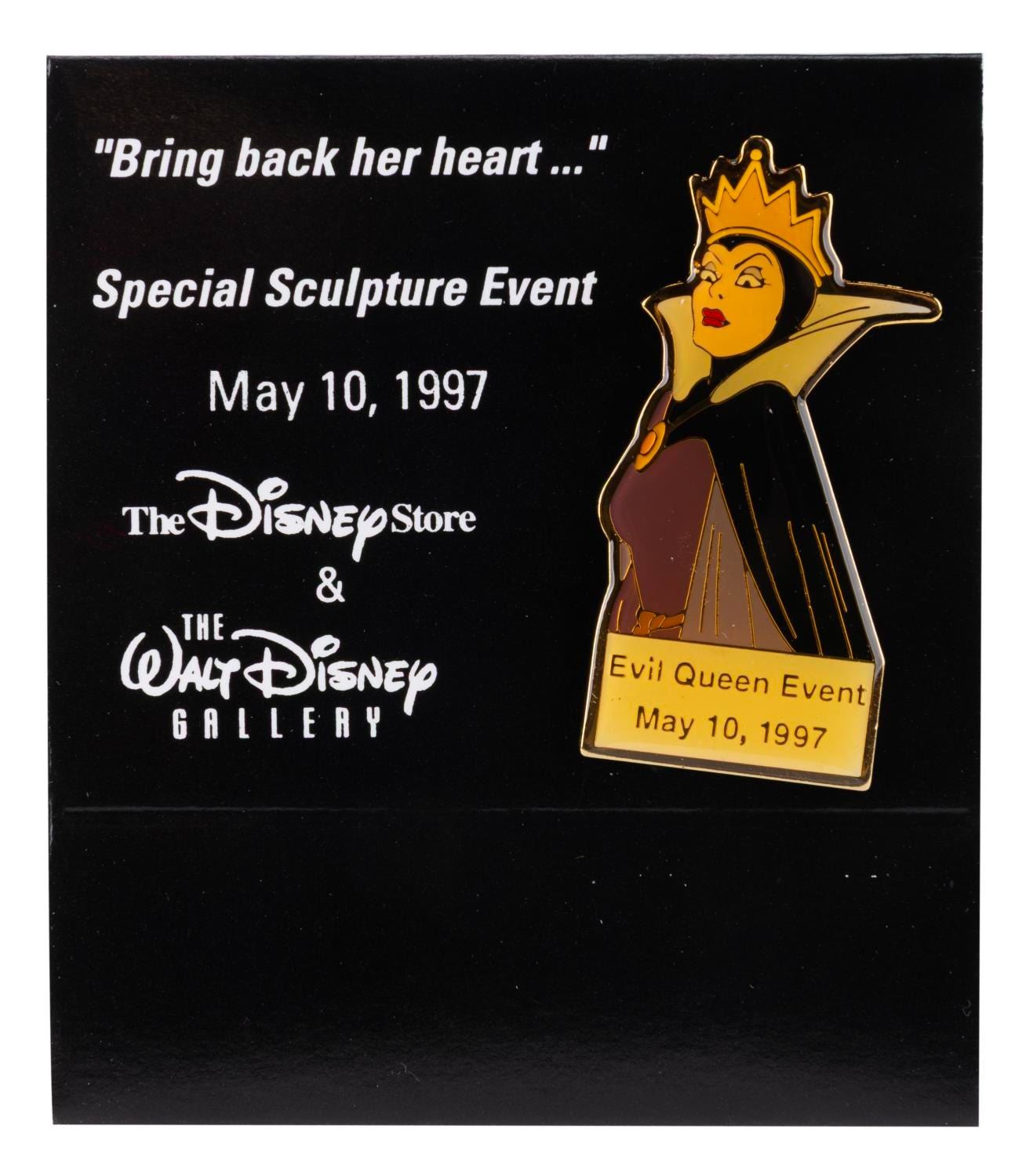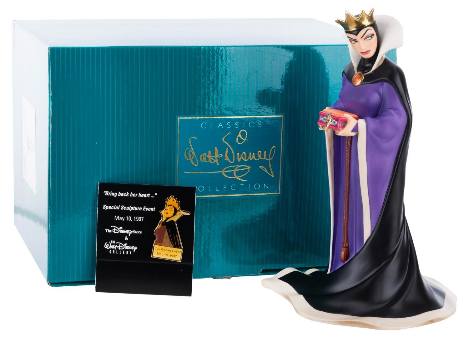 (WDCC, 1997) A Walt Disney Classics Collection "Bring Back Her Heart" figurine and pin of the Evil Queen. The figurine was sculpted by Kent Melton and released with the pin on May 10, 1997, as the Spring Sculpture Event piece. Measuring 5.5" x 5.75" and 9.5" tall, the figurine comes with its original box and is in fine condition, while the pin is in very good condition with color shift from age.