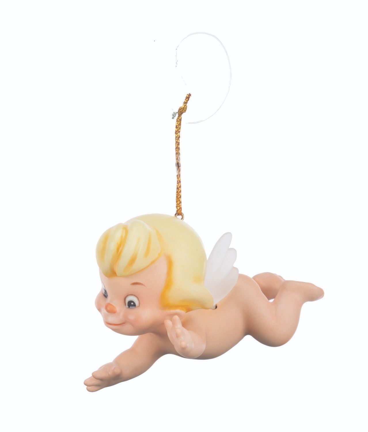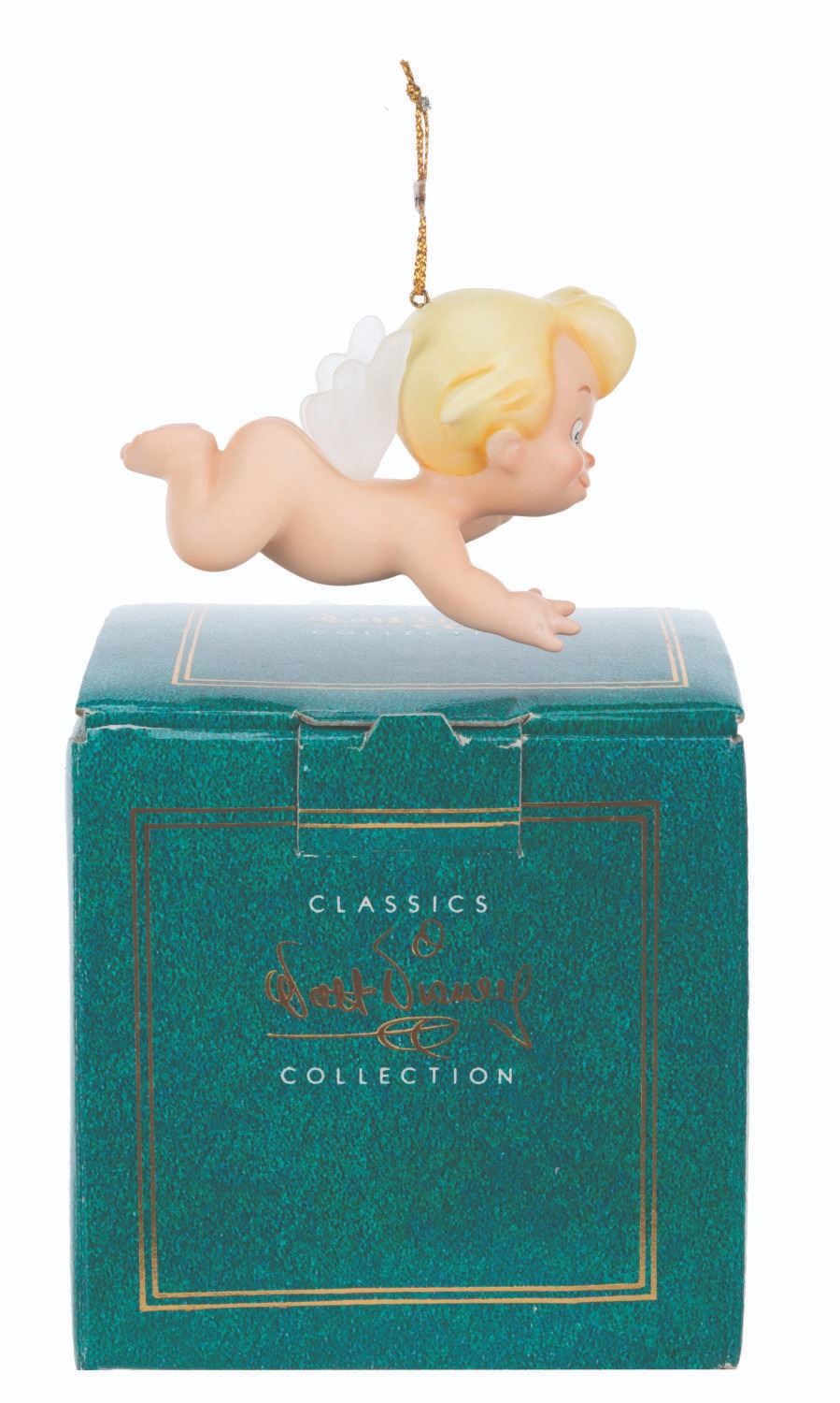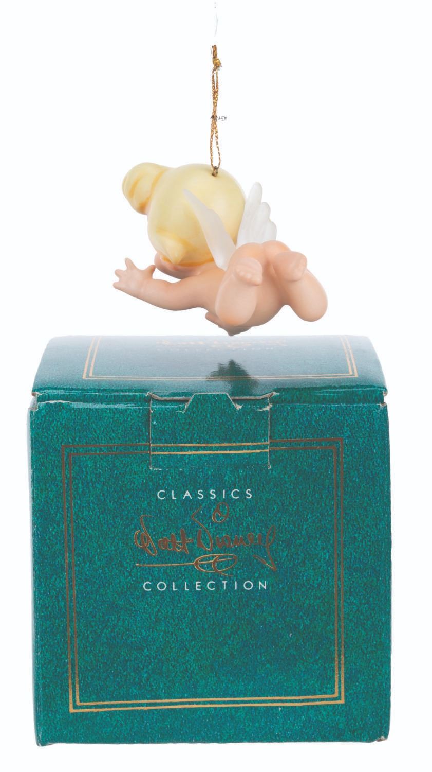 (WDCC, 1994) A Walt Disney Classics Collection figural Cupid ornament titled "Flight of Fancy, " inspired by the Pastoral Symphony segment of "Fantasia. " The ornament was sculpted by Kent Melton and released at the 1994 Ornament Event. Measuring 2.75 " long, the ornament is in fine condition with its original box.