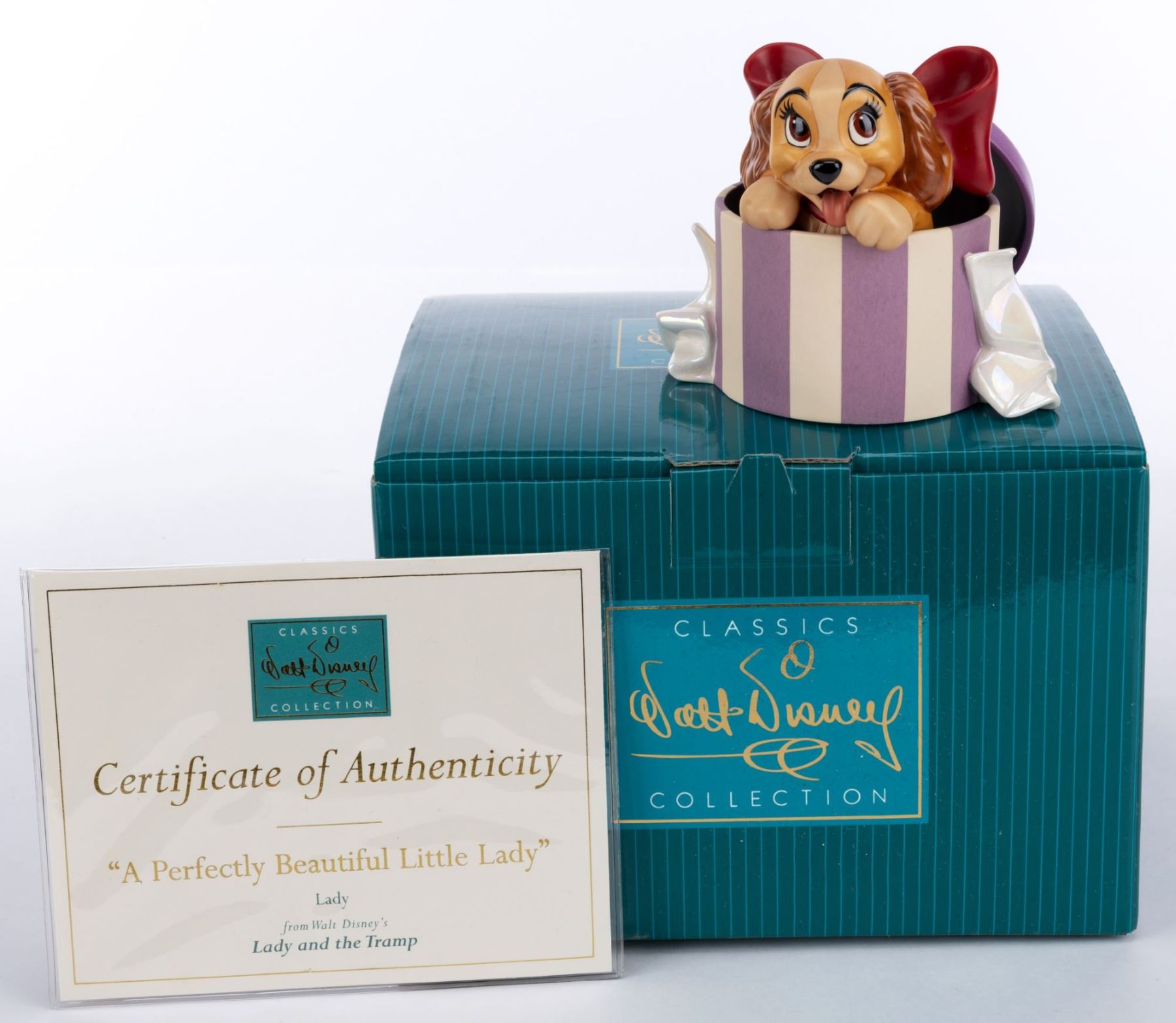 (WDCC, 1999) A Walt Disney Classics Collection figurine of Lady from “Lady and the Tramp." Titled “A Perfectly Beautiful Little Lady," the figurine was sculpted by Gwen Dutcher and released as the 1999 Membership Gift. Measuring 4.25" x 4" and 3.5" tall, the figurine is in fine condition and comes with the original 7.5" x 7.5" x 5.25" box and COA.