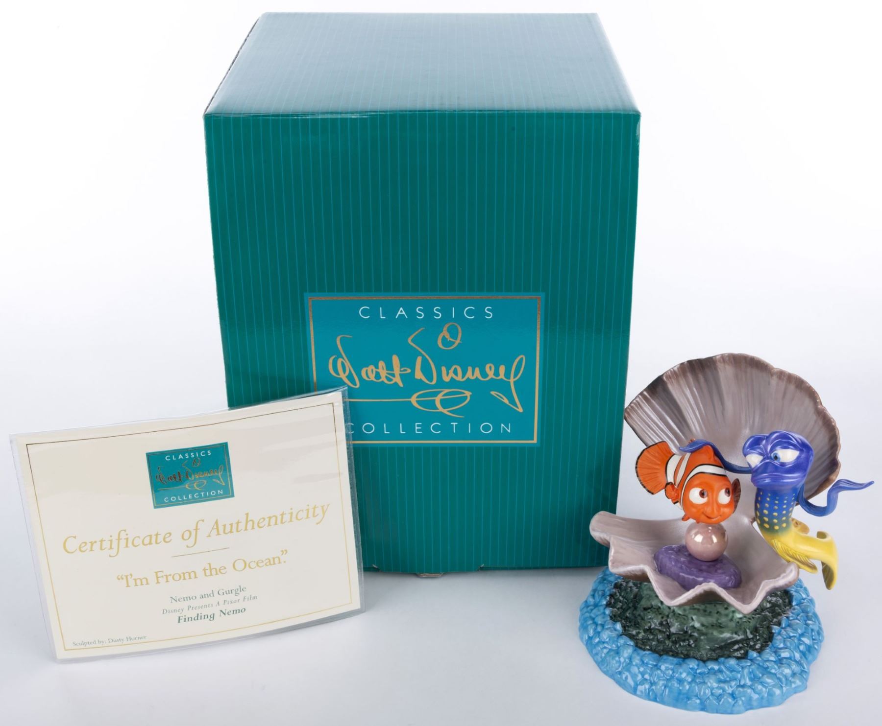 (WDCC, 2005) A Walt Disney Classics Collection figurine of Nemo and Gurgle from "Finding Nemo." The figurine is titled “I’m From the Ocean" and was sculpted by Dusty Horner. Measuring 4.75" x 4.75" and 4.25" tall, the figurine is in fine condition and comes with the original 7" x 9" x 7.25" box and COA.