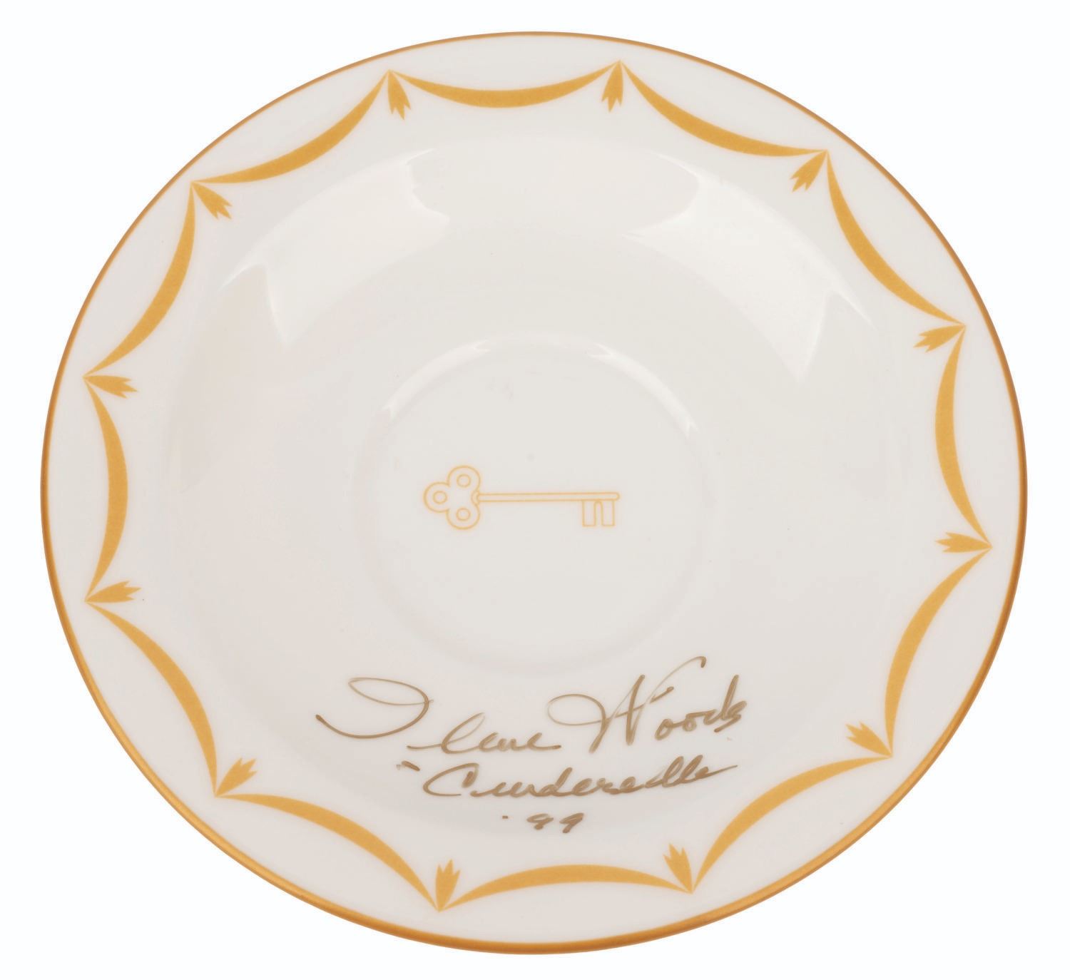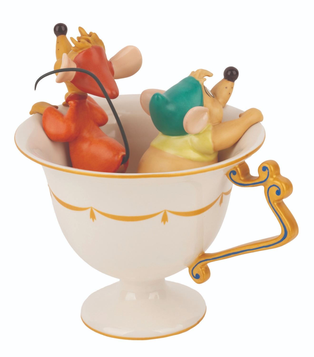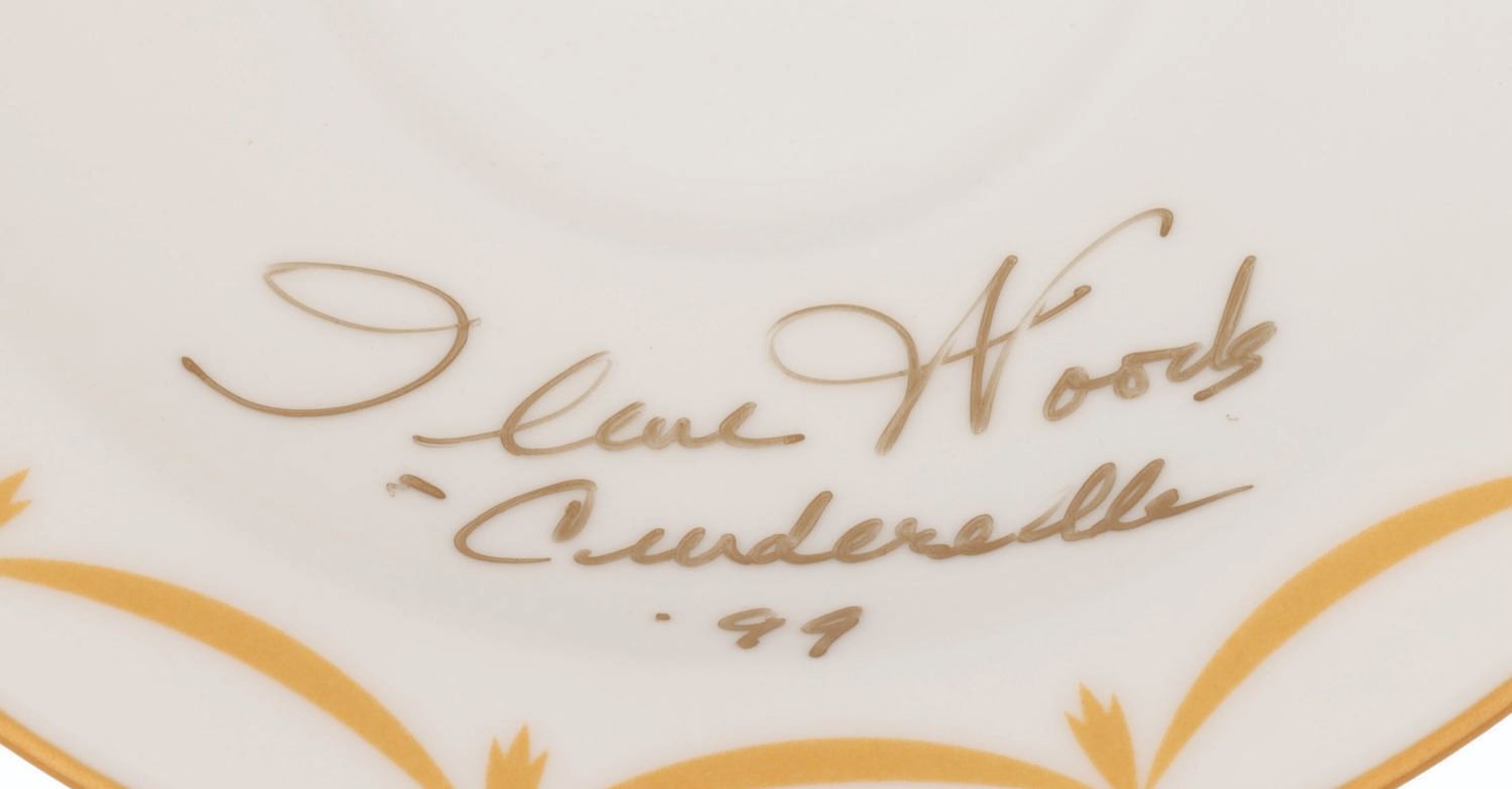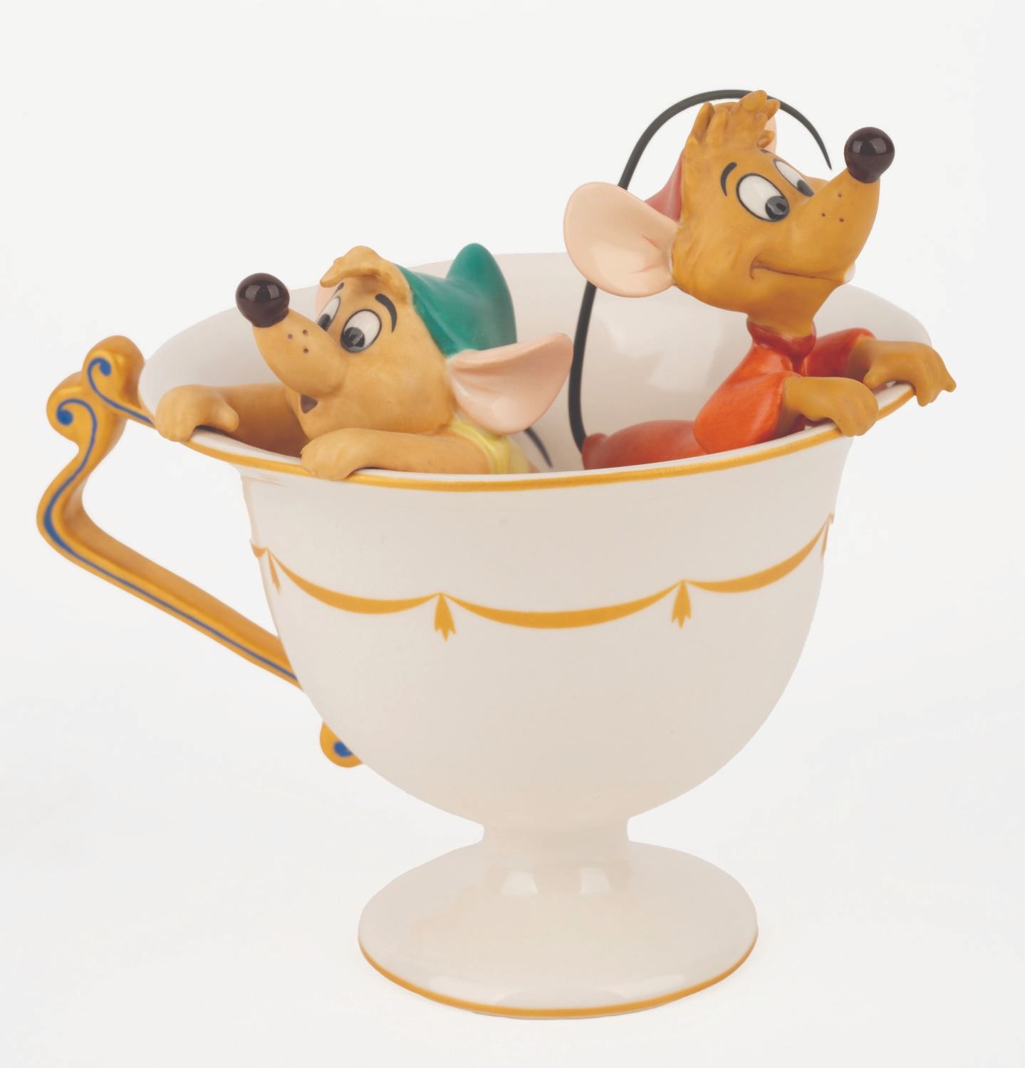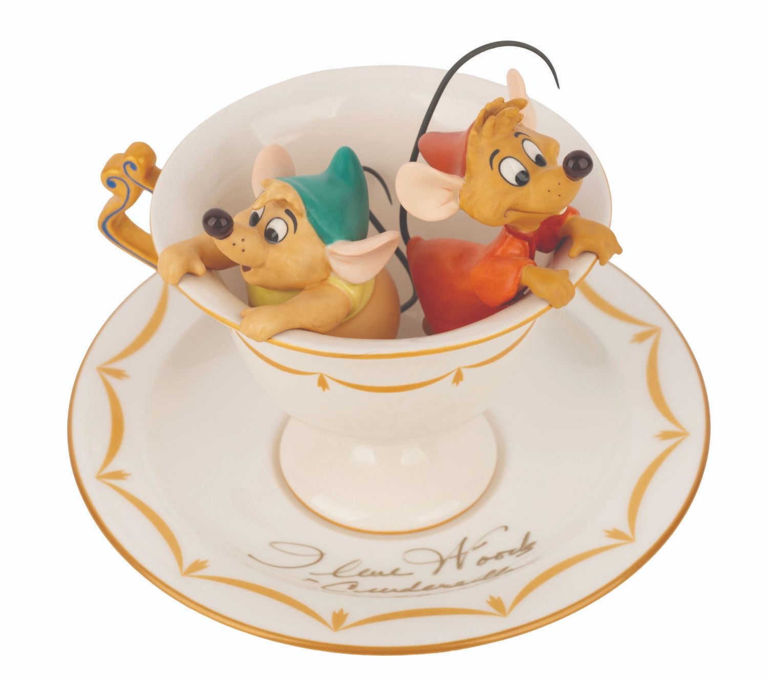 (WDCC, 1999) A Walt Disney Classics Collection figurine of Gus and Jaq from "Cinderella," sculpted by Patrick Romandy-Simmons and titled "Tea for Two." The figurine was released at the 1999 Fall Event with the matching Royal Daulton saucer available as an additional purchase. The saucer has been signed by Ilene Woods, the voice of Cinderella. Both the saucer and figurine are in fine condition.