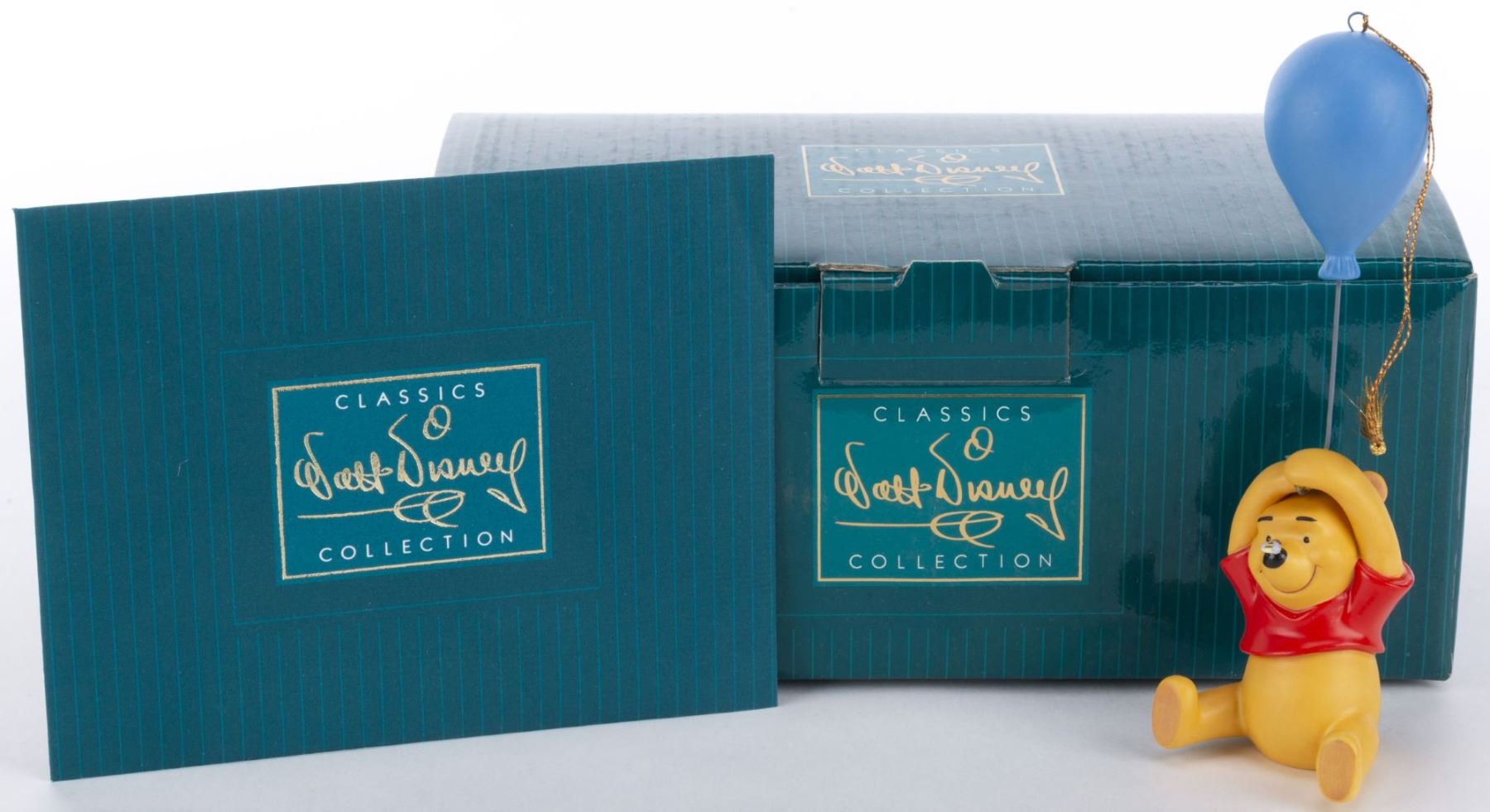 (WDCC, 1997) A Walt Disney Classics Collection figural ornament of Winnie the Pooh from Walt Disney's animated adaptation. Titled “Up to the Honey Tree," the figurine was released for the 1997 Ornament Event. Measuring 1.75" x 2" and 5.5" tall, the figurine is in fine condition and comes with the original 8.25" x 5" x 3.5" box.