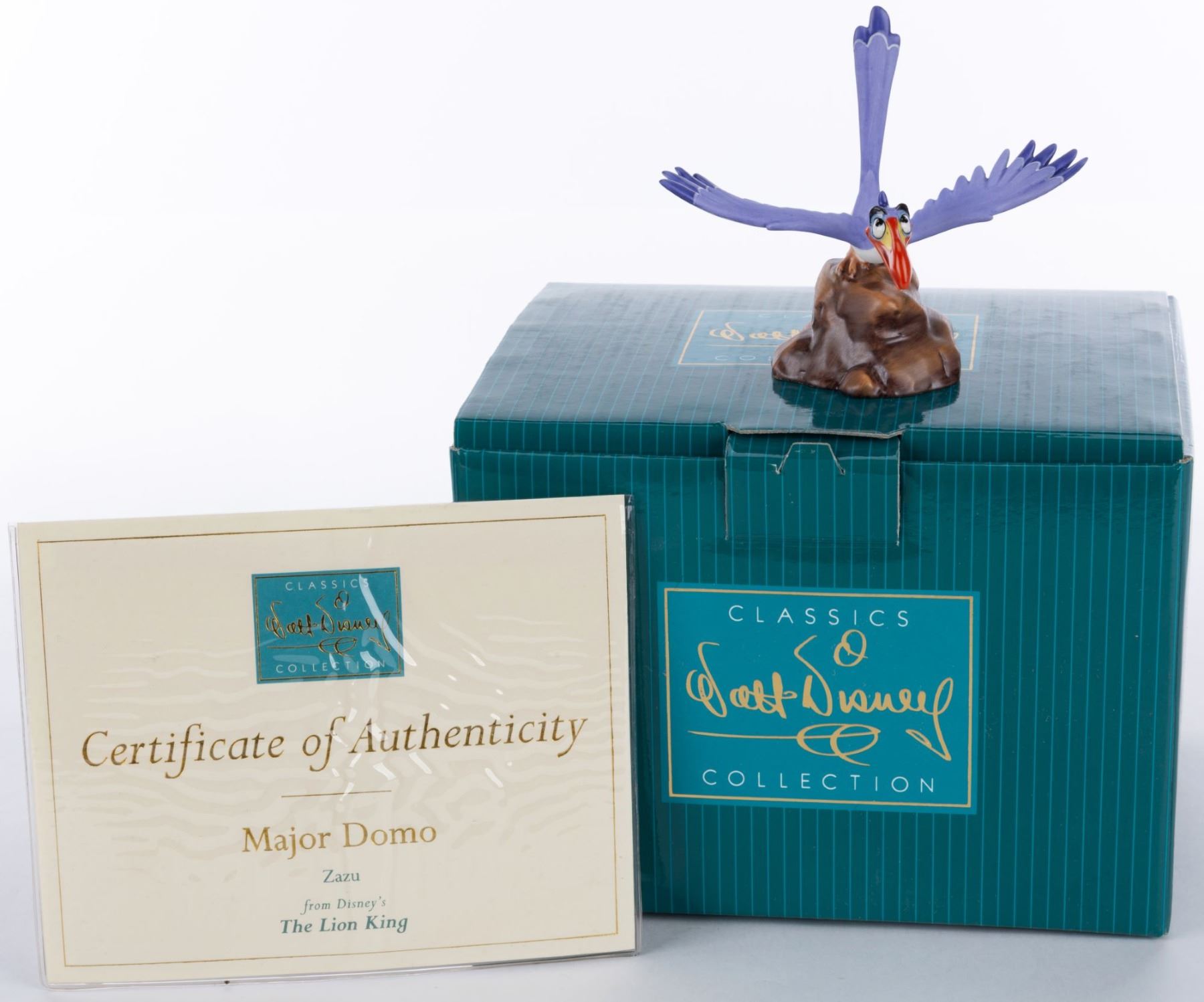 (WDCC, 1999) A Walt Disney Classics Collection figurine of Zazu from “The Lion King." Titled “Major Domo," the figurine was sculpted by Kent Melton and released in 1999. Measuring 3.75" x 2.75" and 3.25" tall, the figurine is in fine condition and comes with the original 6.5" x 5.75" x 4.75" box and COA.