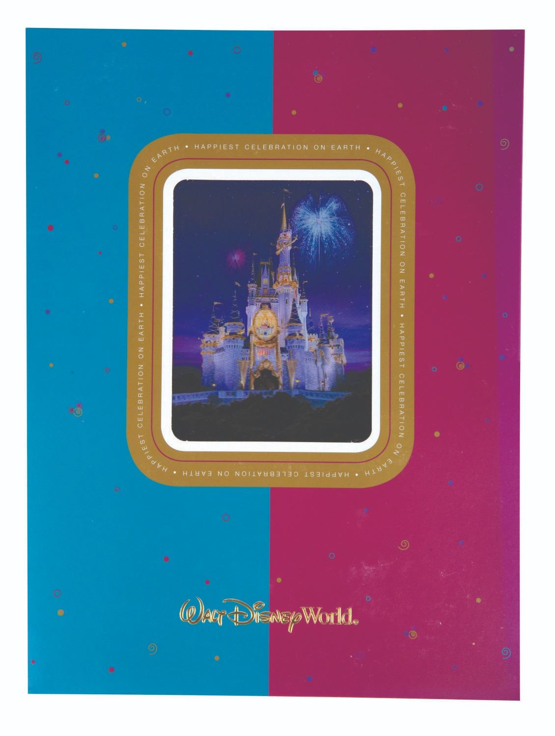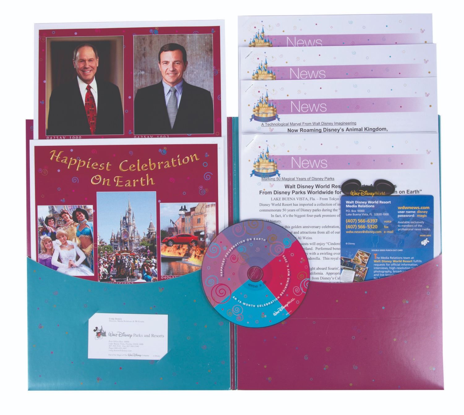(Walt Disney World, 2005) A Press Folder for Happiest Celebration on Earth, the Walt Disney World event commemorating the 50th anniversary of Disney Parks. With a lenticular image of Cinderella's Castle under fireworks, the folder contains a key to press photos available online, a photo CD, and press briefs on the Celebration, the "Magic Your Way" promotion, and the new animatronic Lucky the Dinosaur roaming the Animal Kingdom. Measuring 9"x12", the folder is in very good condition, with creases to one interior pocket edge.
