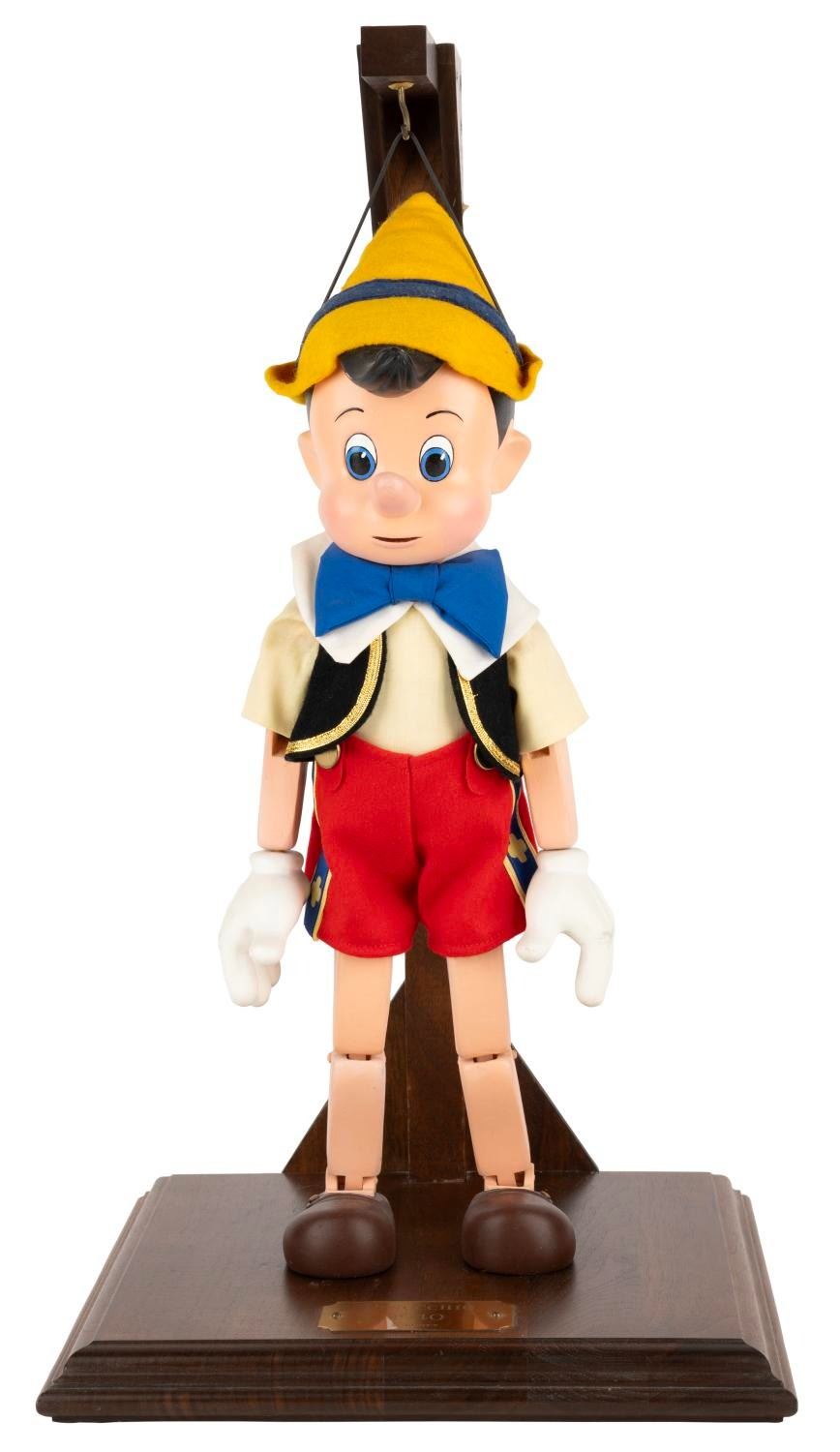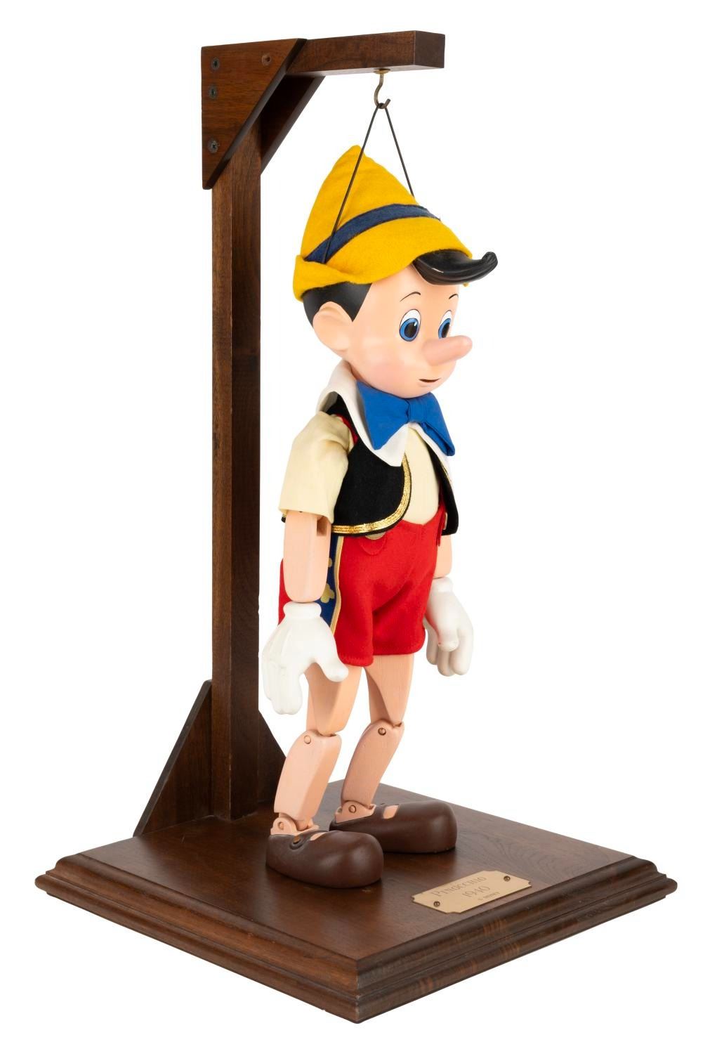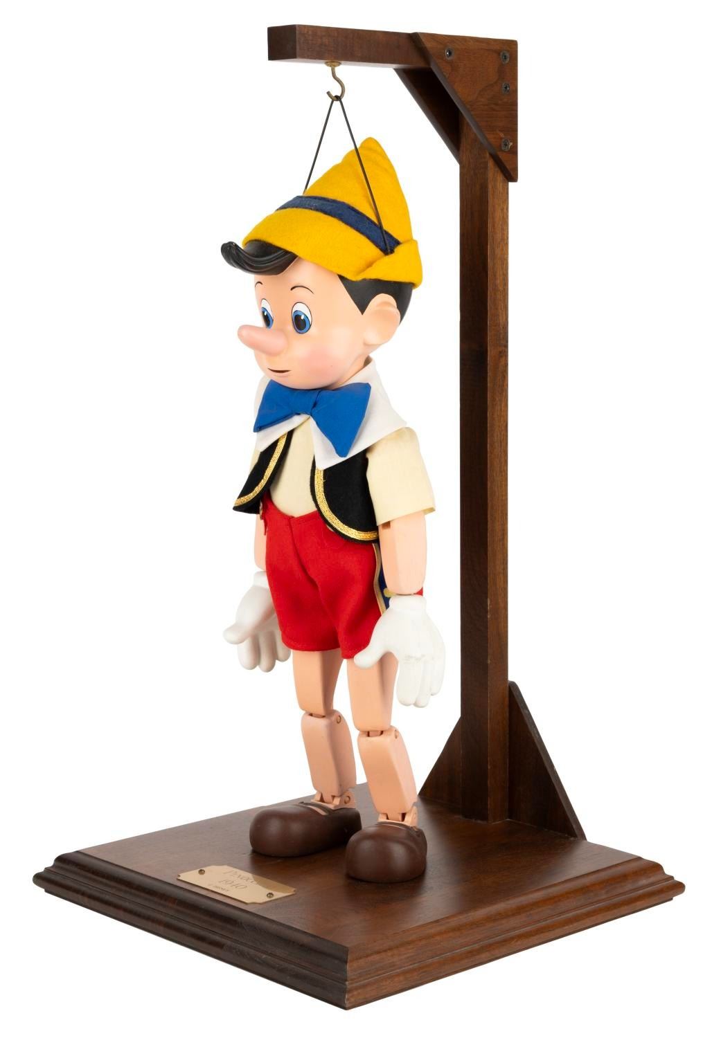 (Disneyland, 1980s) A beautifully crafted Pinocchio figure which was created by the same WED Imagineering model makers who developed the popular Main Street window displays in the 1970-80s. Figures such as this were hand-crafted in very small numbers to be sold at the Disneyana Shop on Main Street for only a short time. Once the few figures were sold, there was no guarantee there would be any others made. As such, these figures are incredibly desirable among collectors for their rarity and craftsmanship. The figure is accomplished in hand-painted resin and wood, with jointed arms and legs, and a wooden display stand. The plaque on the base reads "Pinocchio 1940." The figure stands 17" tall on the display measuring 11.5” x 11.5” x 21” high. The figure is in very good condition, with some small scuffs to the hands and feet. The display is in very good condition with scratches to the brass plaque.
