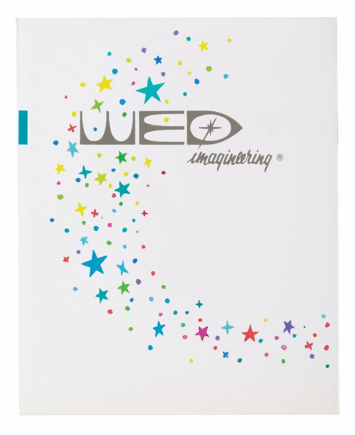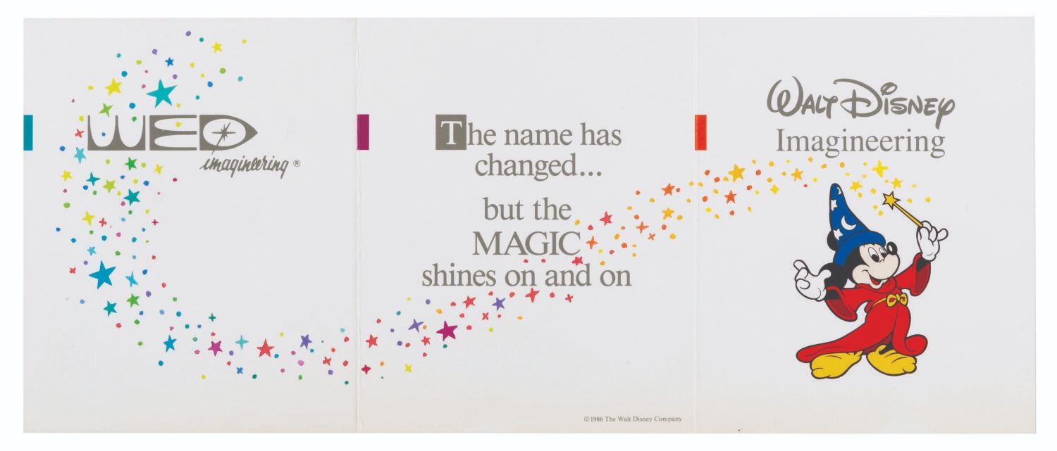 (Disney, 1986) A fold-out card announcing the name change of WED Imagineering to Walt Disney Imagineering, featuring Sorcerer Mickey as part of the new logo. Measuring 5.25” x 4.25” when closed and 5.25” x 12.75” when opened, the card is in very good condition with light wear from handling.