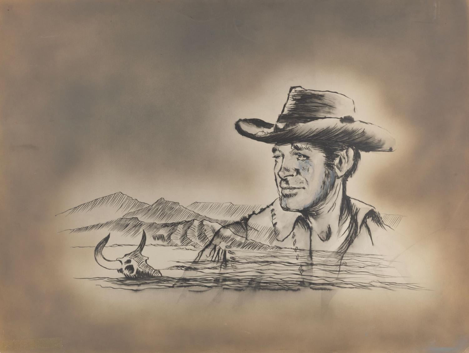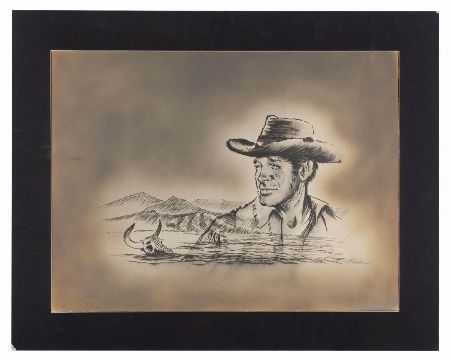 (NBC/ABC, 1957-65) A production-used title credit from the Western TV series"Wagon Train." The artwork for actor Robert Horton includes hand-painted silver accents. With an image size of 19.5" x 26" mounted to a 25.5" x 32" board and matted, the artwork is in good condition with scratches, smudges, creases, tape residue, and edge wear from production use. The matte is in fair condition with heavy wear.