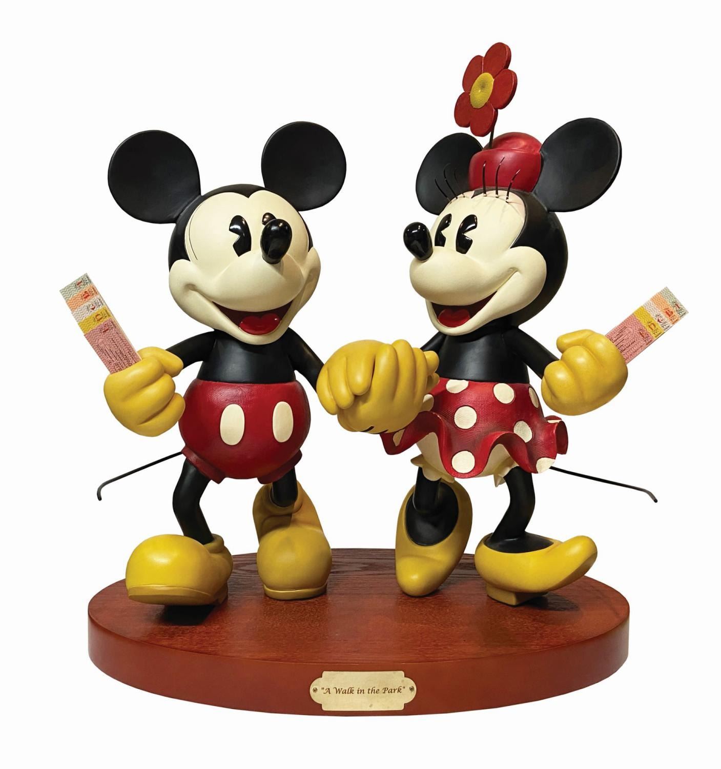 (Walt Disney World, 2007) A charming "Big Fig" of Mickey and Minnie Mouse titled "A Walk in the Park" by artist Richard Sznerch. The pie-eyed couple walk hand-in-hand, each holding an A-E park ticket booklet. Crafted largely in resin with mixed media details, the pair are attached via pegs to a wooden stand, with a title plaque on the front. Measuring 20.5" tall on its 11"x19" stand, the figure is in very good condition with minor wear, including a few spots of paint loss on Minnie's eyelashes and Mickey's tail.
