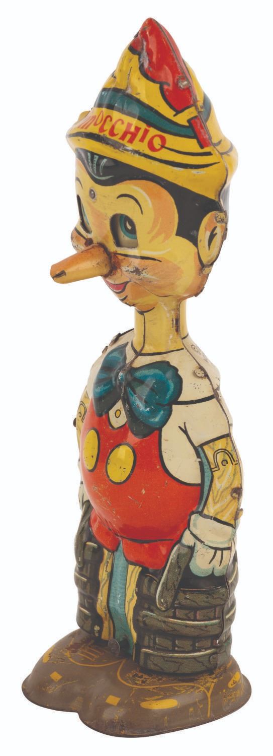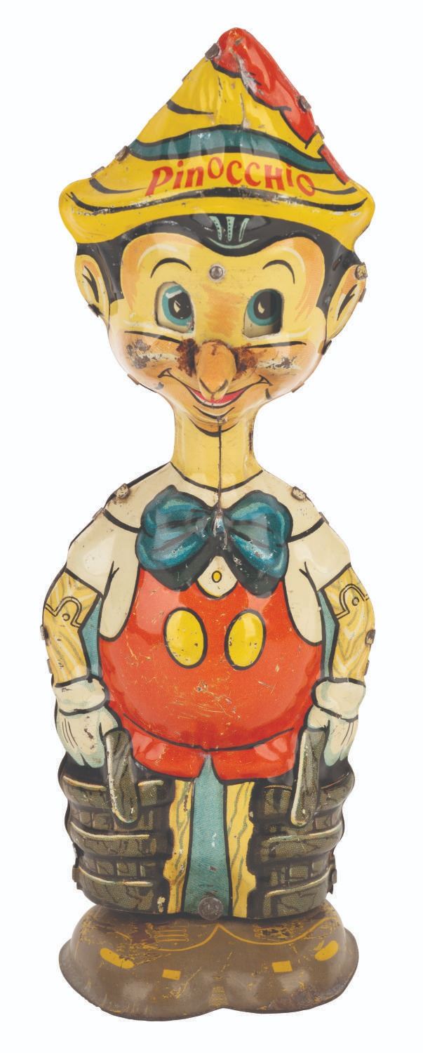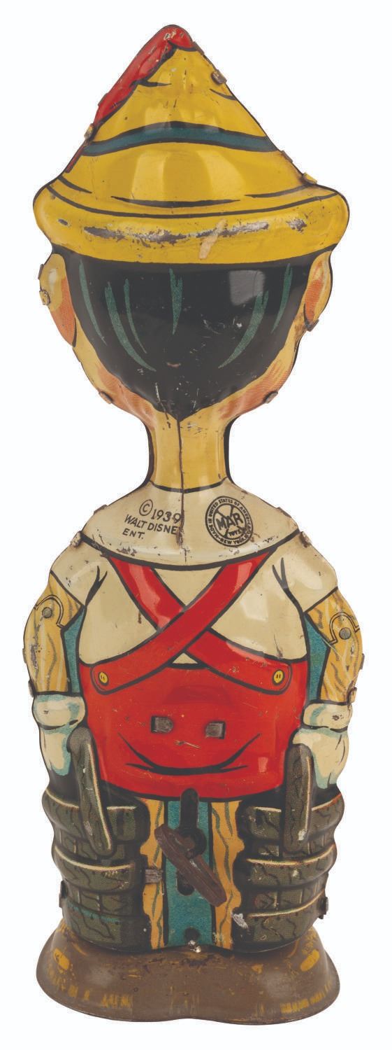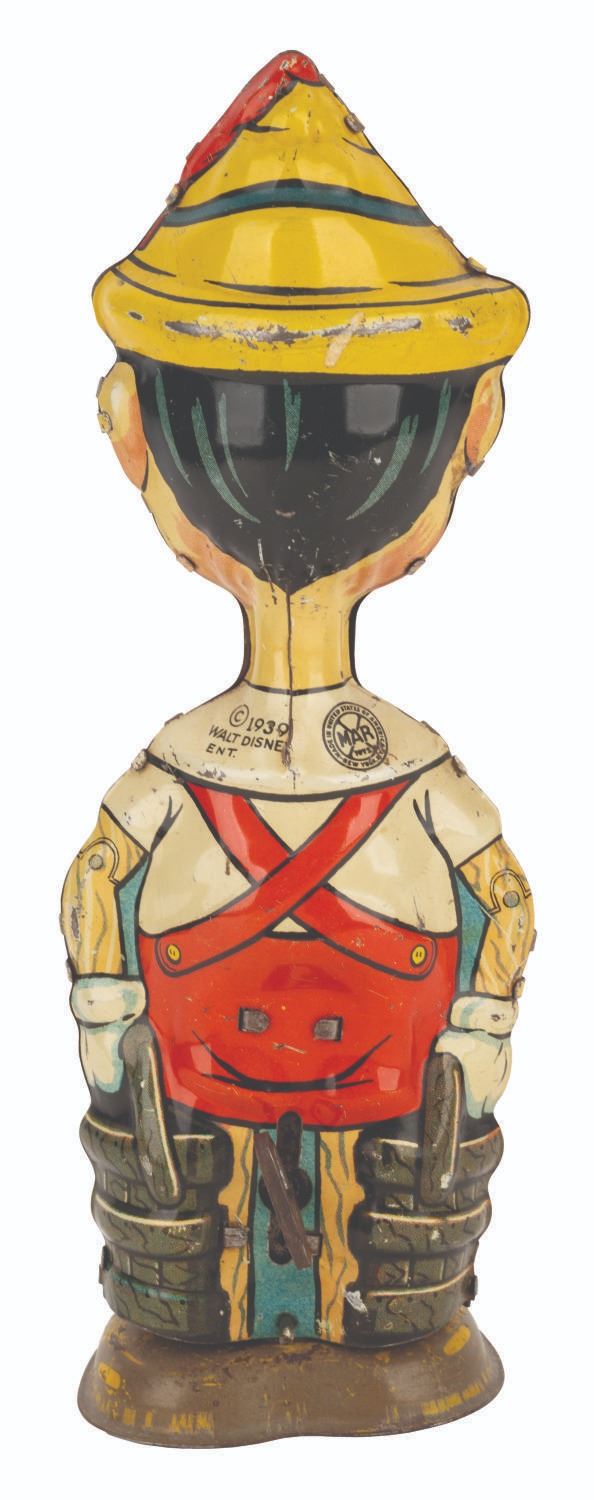 (Louis-MARX, 1939) A tin-litho Pinocchio wind-up toy manufactured by Louis Marx & Co. Measuring 8.5" tall and 3"x3", the toy displays in good condition, exhibiting scuffs, scratches, light oxidation, and wear, and requiring service to function.