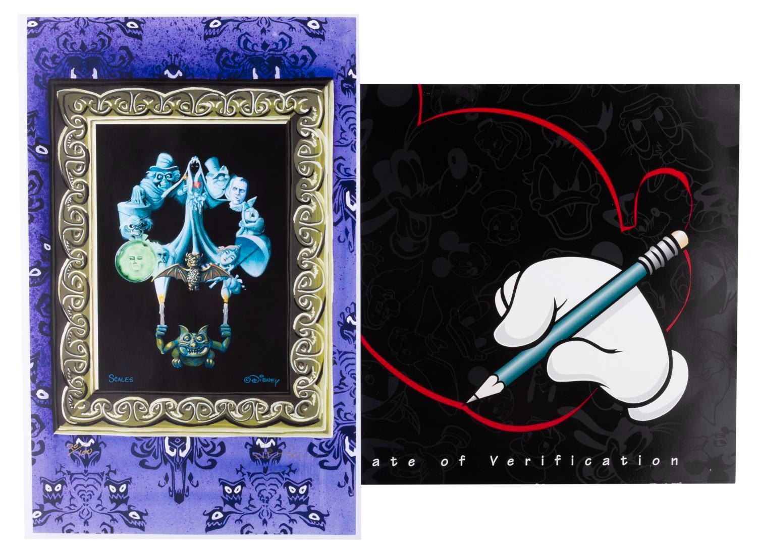(Disneyland, 2003) A print of the artwork"Wall to Wall Creeps" signed by Disney artist Eric Scales. The original was used to create a limited edition 100 Haunted Mansion watch, with this print included with the purchase. Measuring 11" x 17", the signed print is in very good condition.