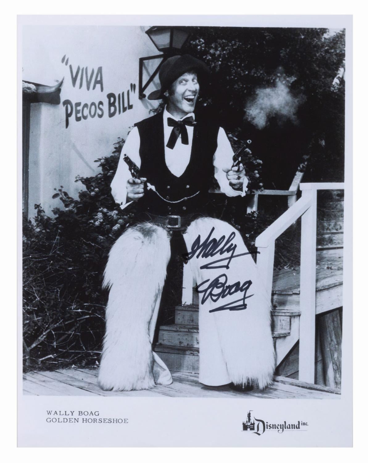 (Boag, 1980s-2000s) A printed black and white photo of Disney Legend Wally Boag, star of the Golden Horseshoe Revue, signed in black marker. Measuring 8.5" x 11", the signed photo is in very good condition with light creases and handling wear.