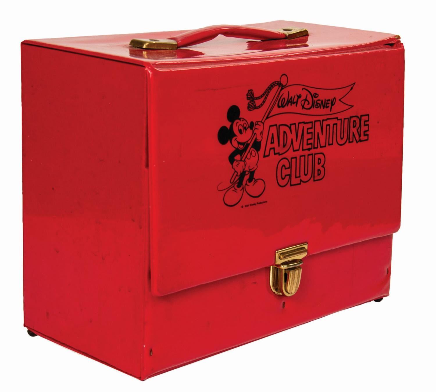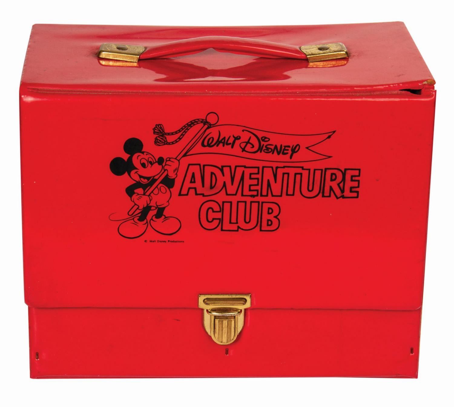(Disney, 1970s) A rare Walt Disney Adventure Club case with a metal clasp. The club included membership cards and activity pages for kids. Measuring 6.25" x 11.75" and 9.75" tall, the red vinyl case displays in good condition with faint stains, scuffs, a 1" tear on the front flap hinge, and one base peg missing.