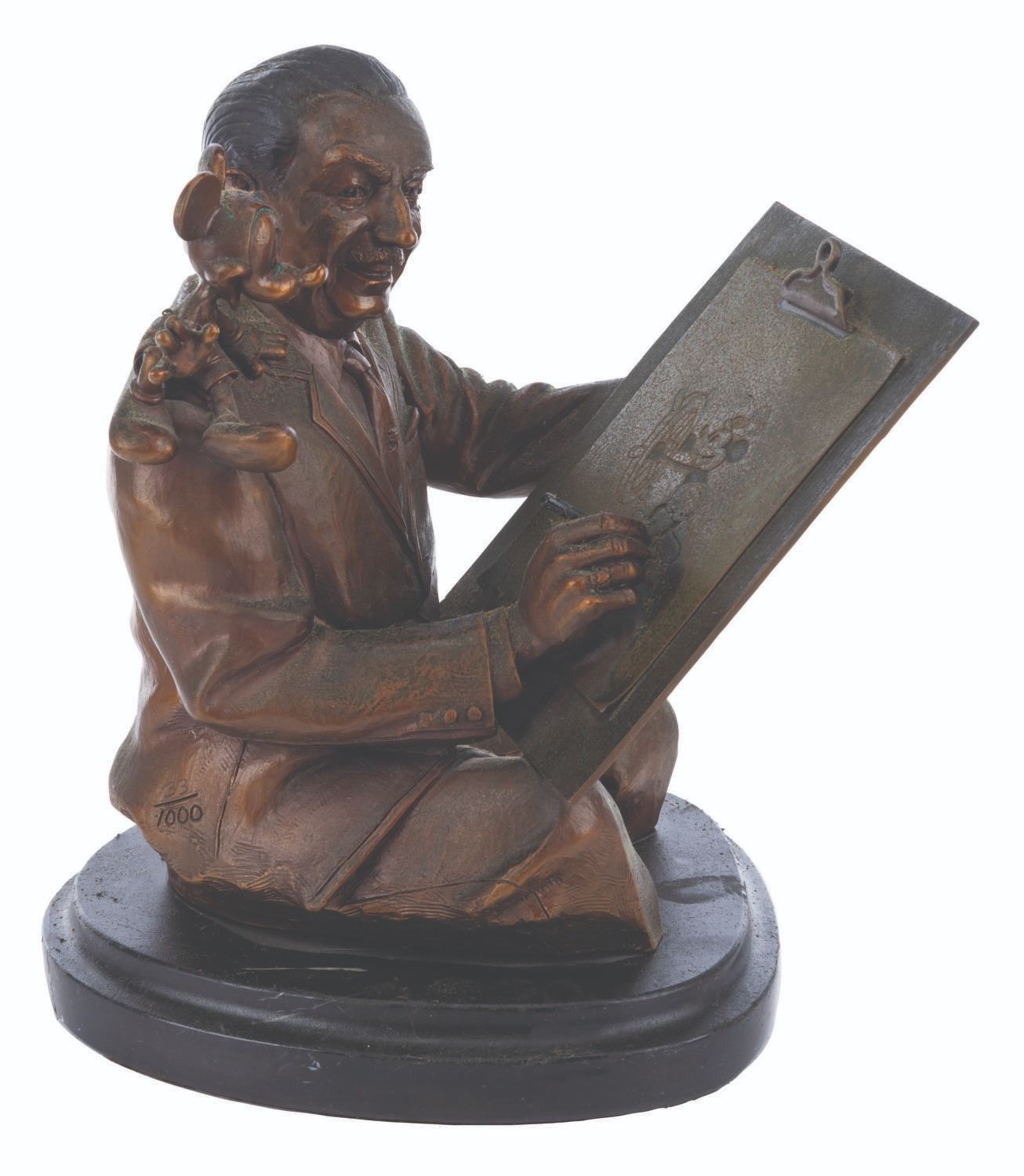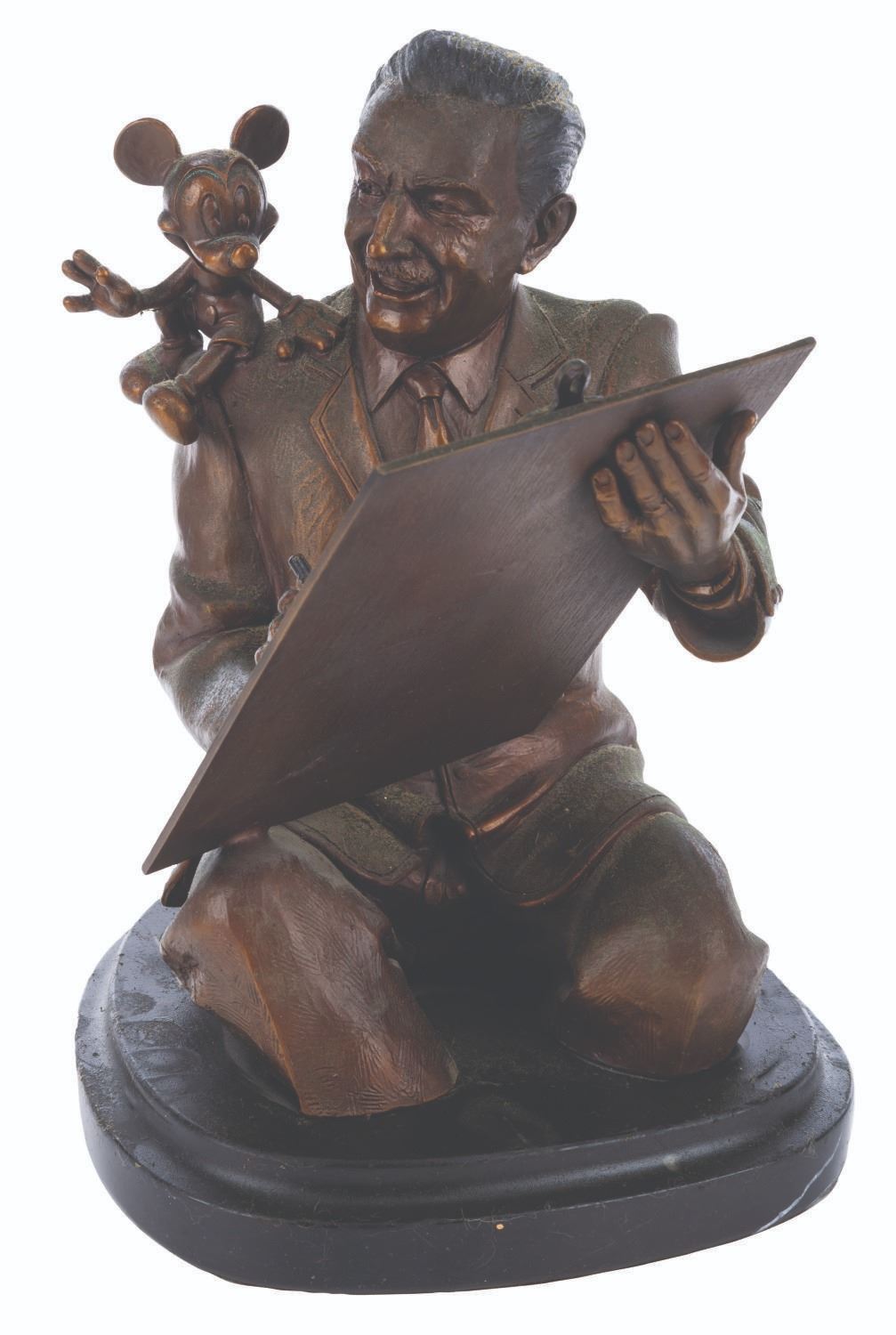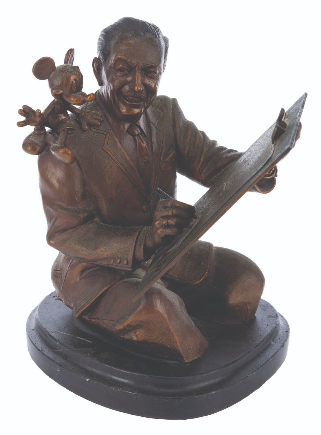 (Disney, 1990s) A bronze sculpture of Walt Disney and Mickey Mouse titled "Walt Draws Mickey." This statue by renowned artist Bill Toma was released in a limited edition and is numbered 33 of 1000. Measuring 7.5" x 8.5" x 11", the sculpture is in fair condition with patina, and the marble base is sticky to the touch.