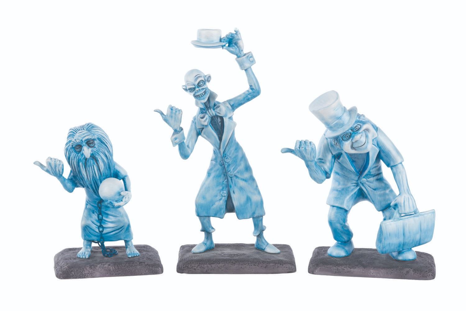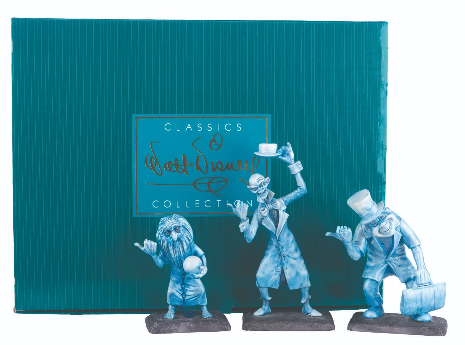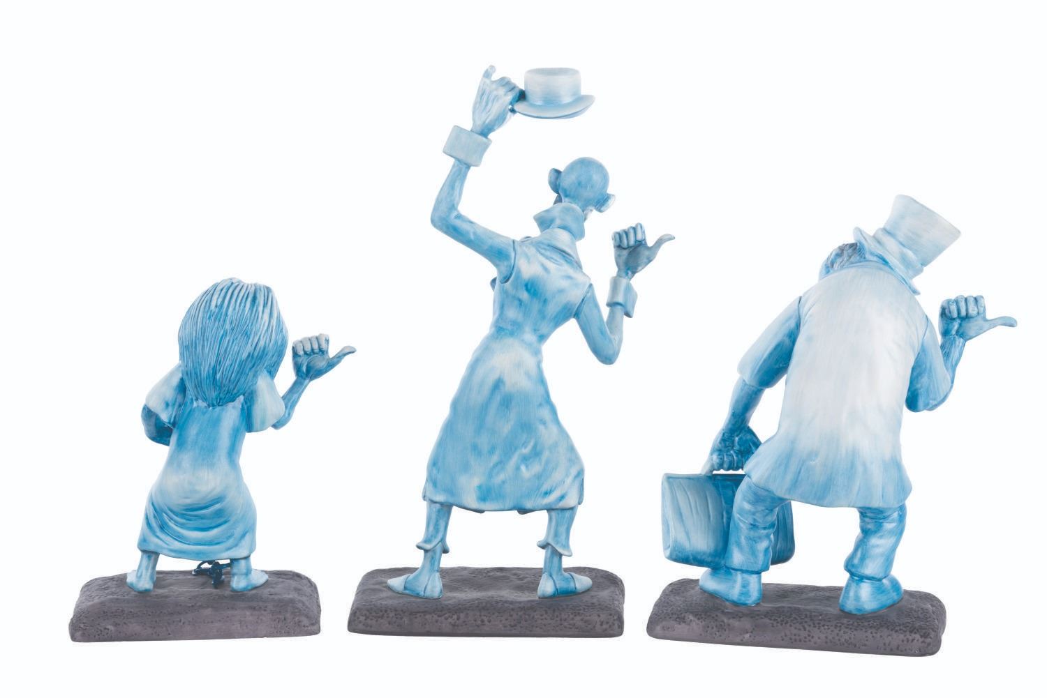 (WDCC/Disney Parks, 1999) A limited edition Walt Disney Classics Collection "Beware of Hitchhiking Ghosts" figure set based on the popular scene from the Haunted Mansion at the Disney Parks. This beautifully crafted figure set was released only at one Disneyana Convention at Walt Disney World in an edition of only 1500 pieces, with this set numbered 1307. The figures stand from 5.25" to 8.5" tall and are in fine, as-new condition with their original box.