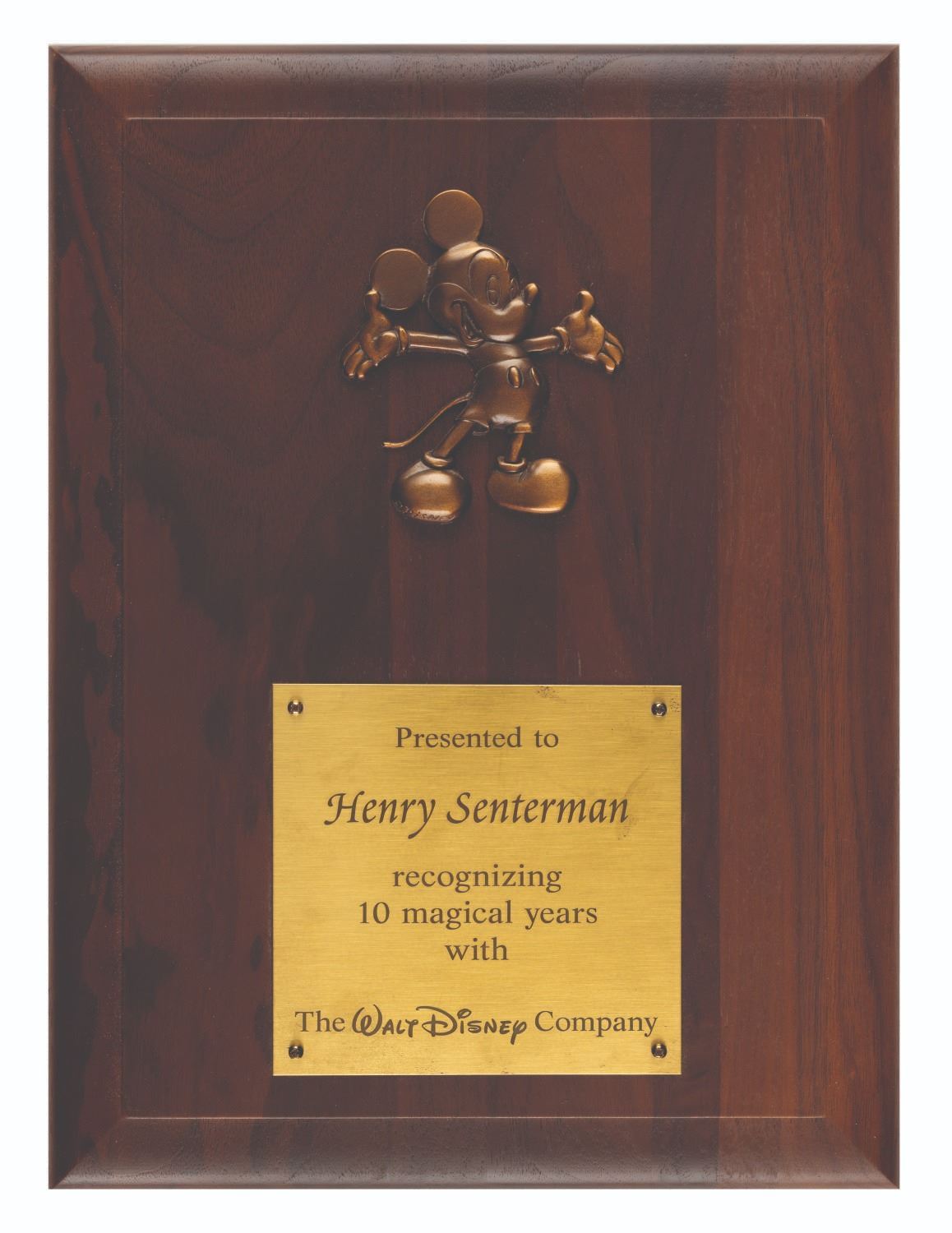 (Disney, 1990s-2000s) A 10-Year Walt Disney Company service award plaque, given to Henry Senterman in recognition of his service to the company. Measuring 9" x 12", the plaque is in very good condition with light wear.