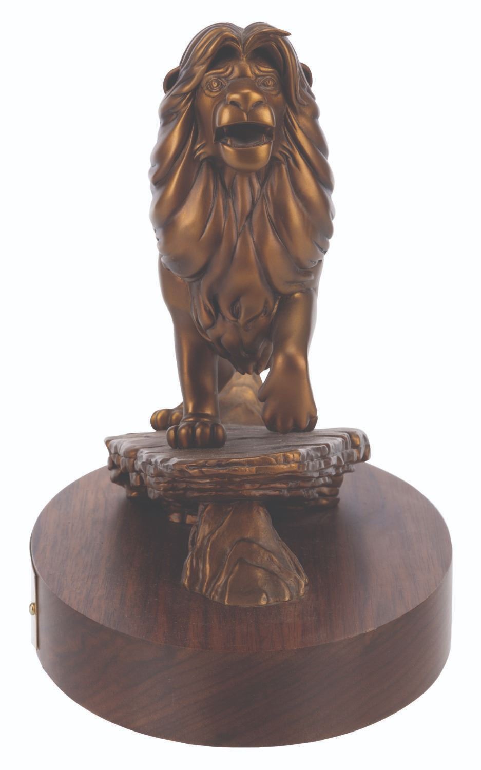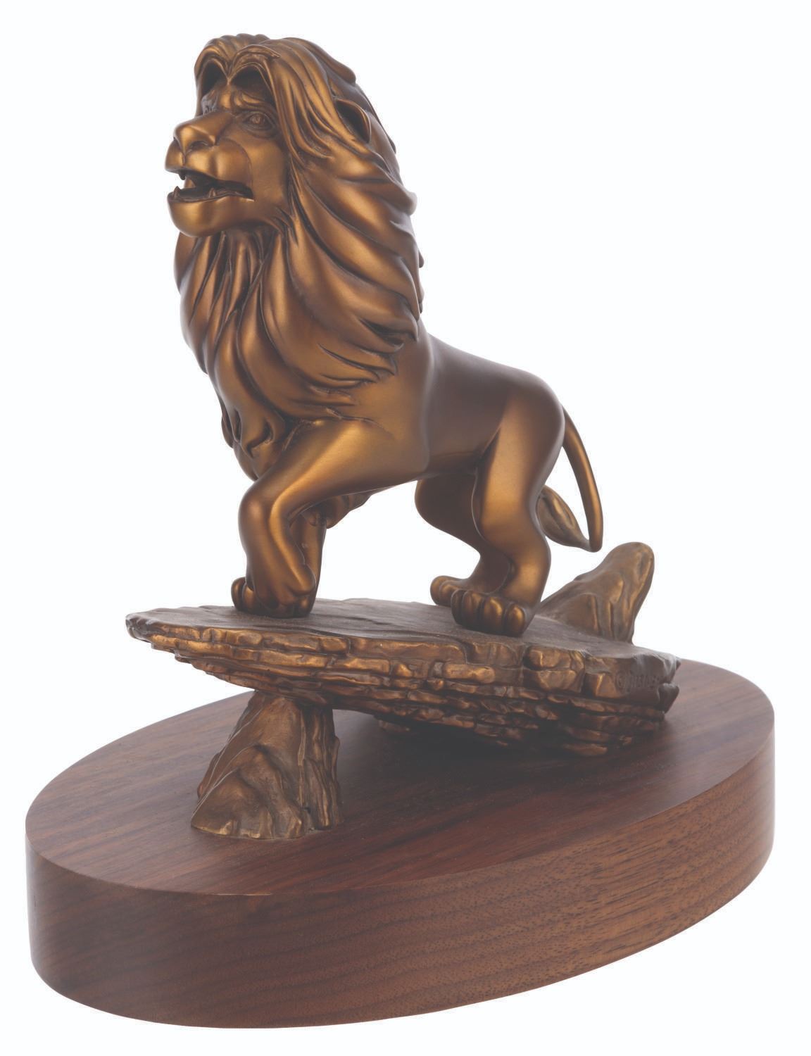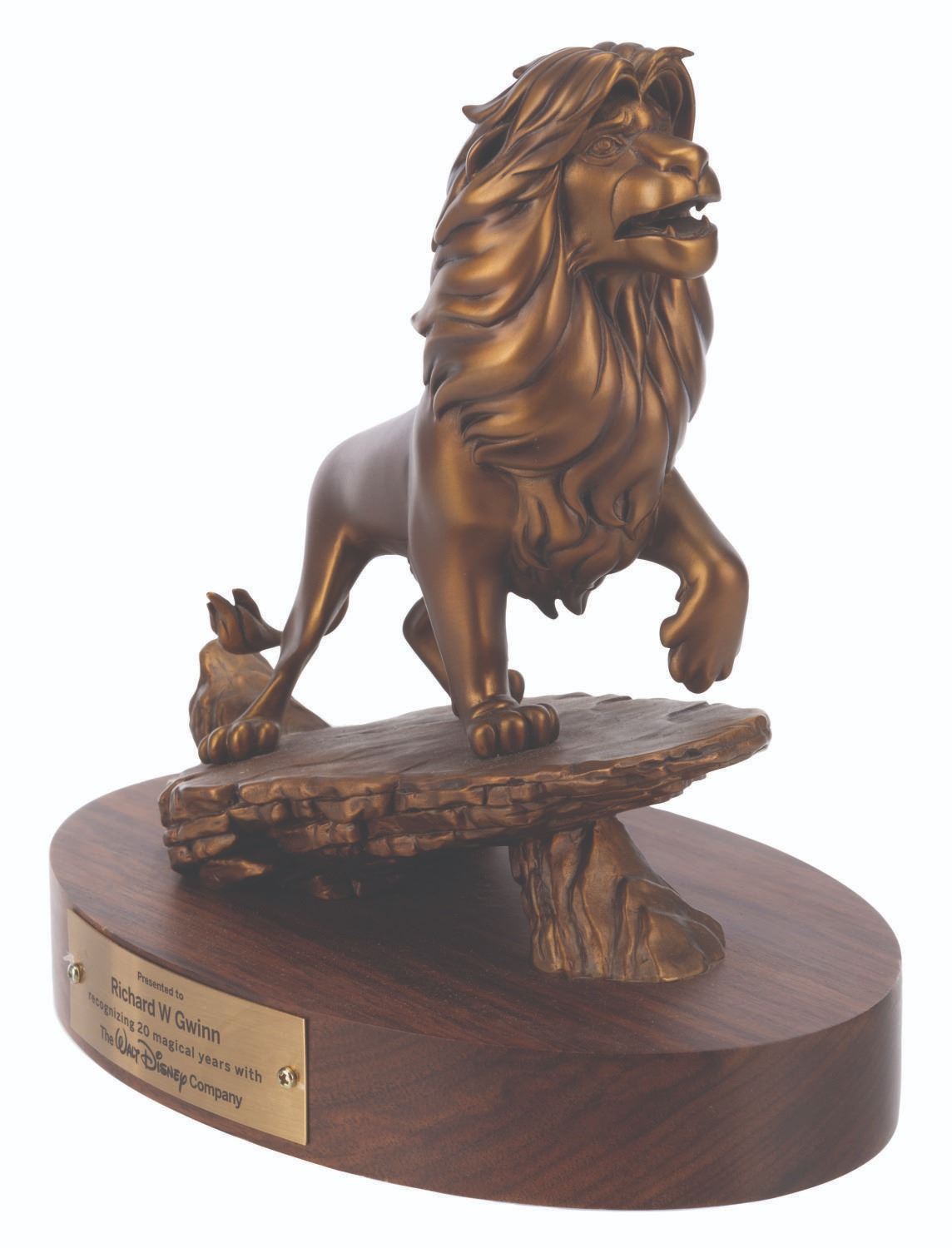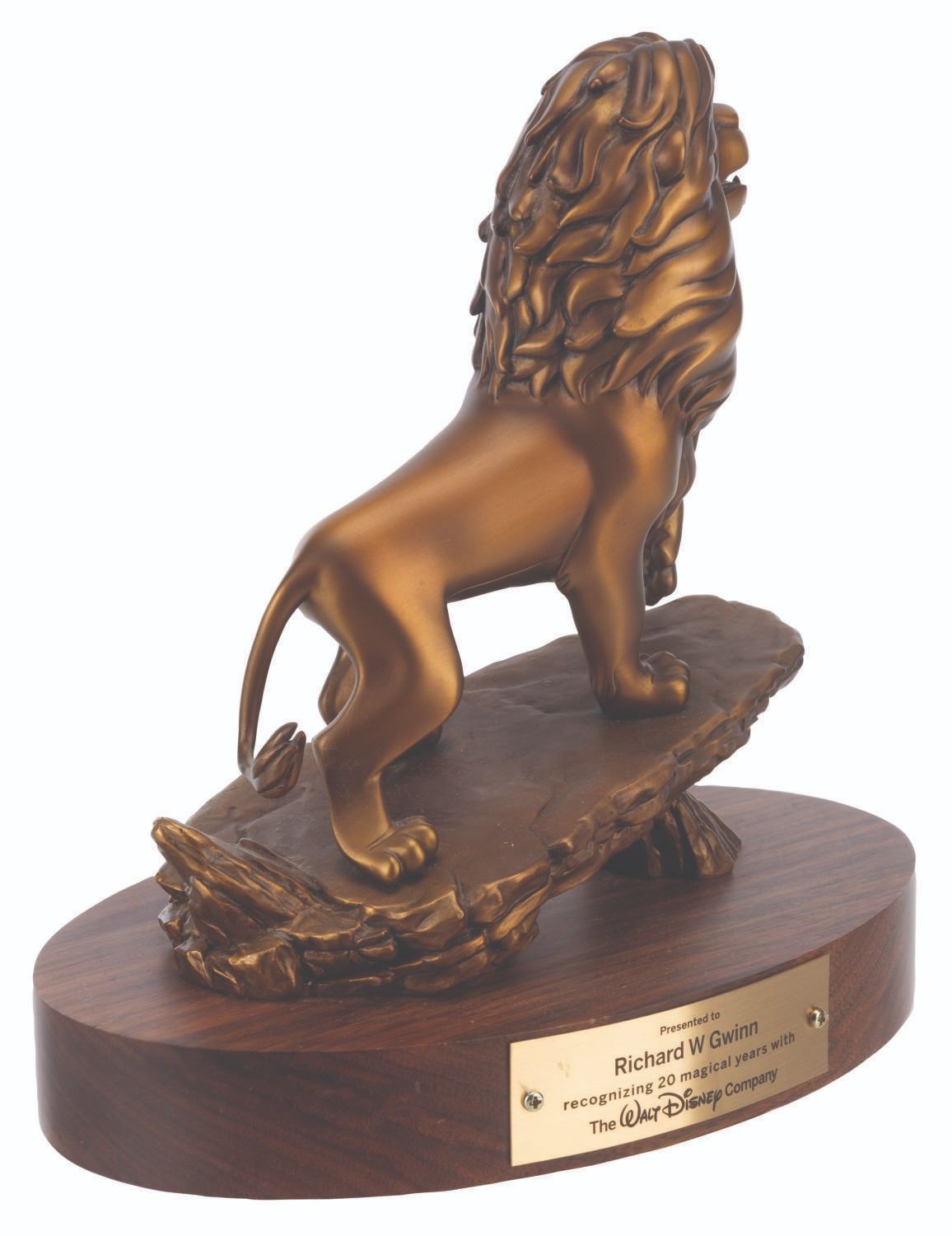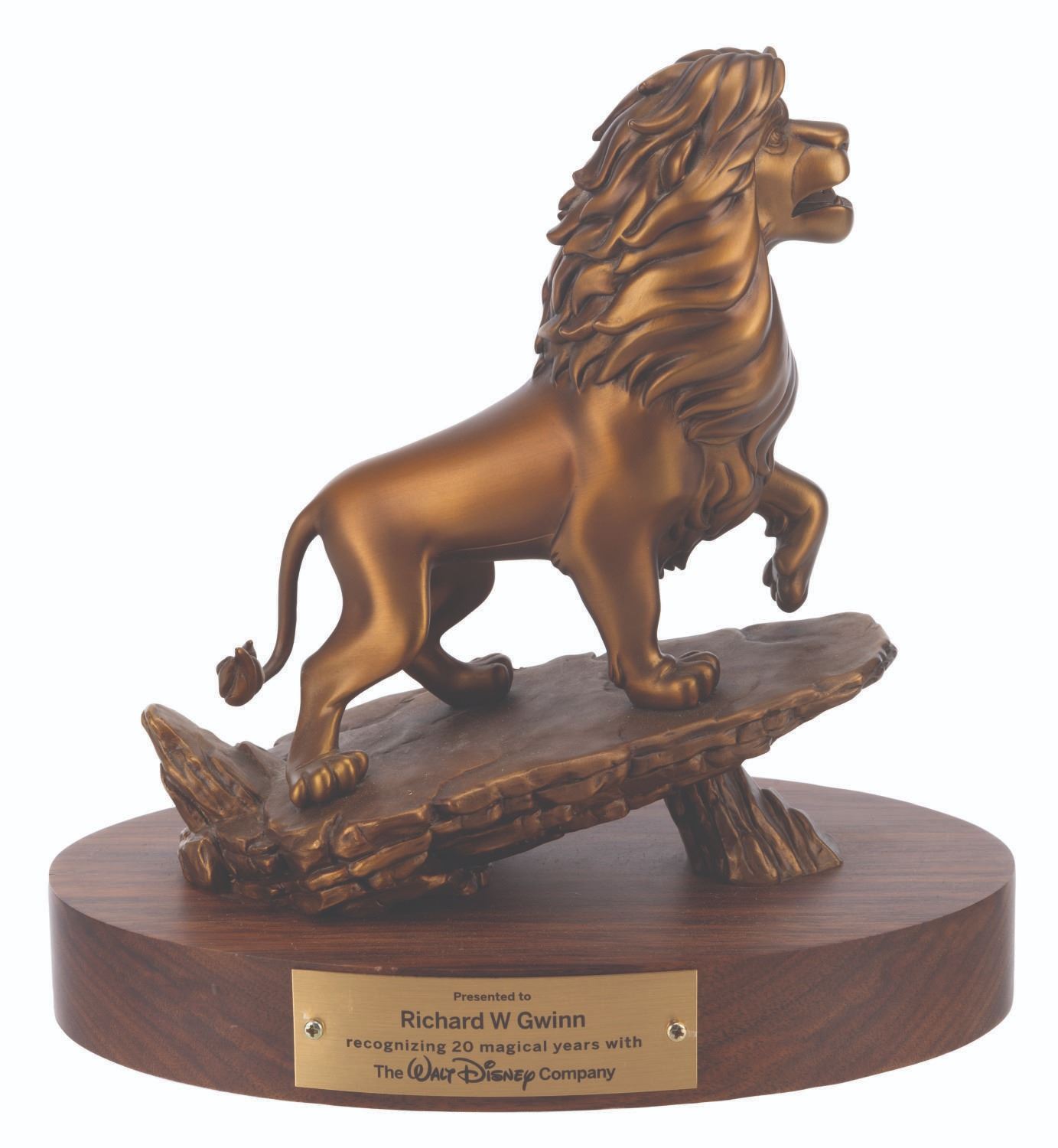 (Disney, 2000s) A rare Cast Member 20-year service award featuring Simba from"The Lion King." This statue was awarded to Richard W. Gwinn, who worked as the Disneyland Resort's Lead Sound Mechanic. Measuring 8" x 5.5" x 8" tall, the bronze award on a wooden base is in very good condition with light scuffs and wear.