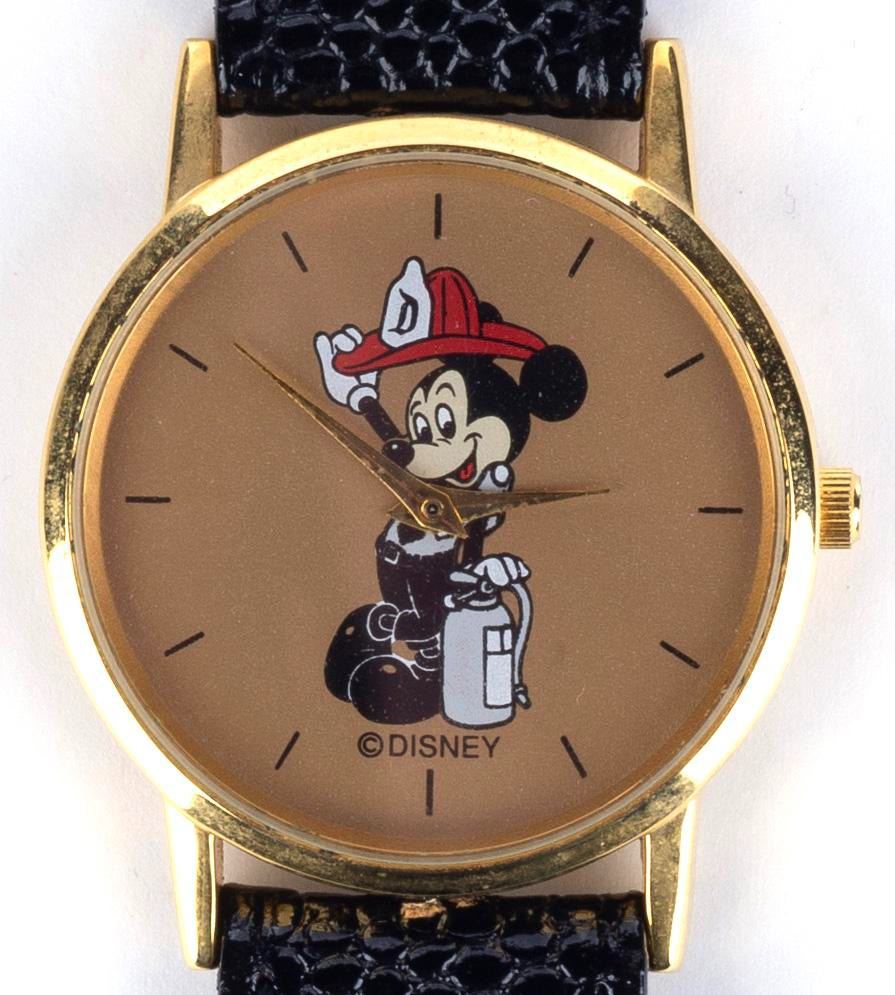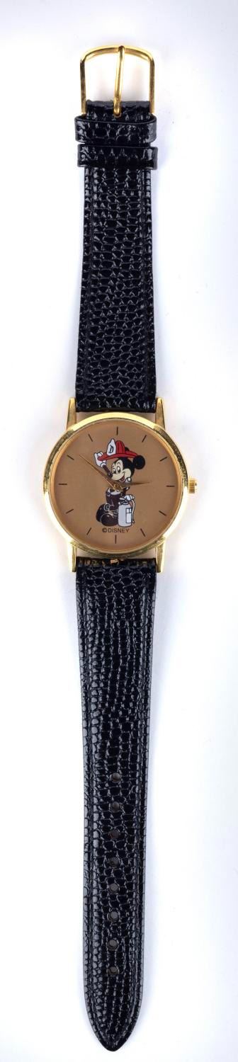 (Disneyland, 1980s-90s) A Disneyland Fire Department Watch. The watch was created for Disneyland Fire Department Cast Members, has a black leather band, and a dial featuring Mickey Mouse with firefighting equipment. The watch is in very good unused condition with minor scuffs to the case.