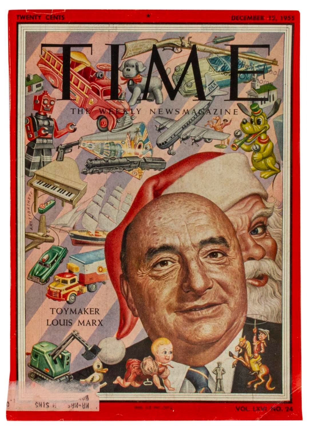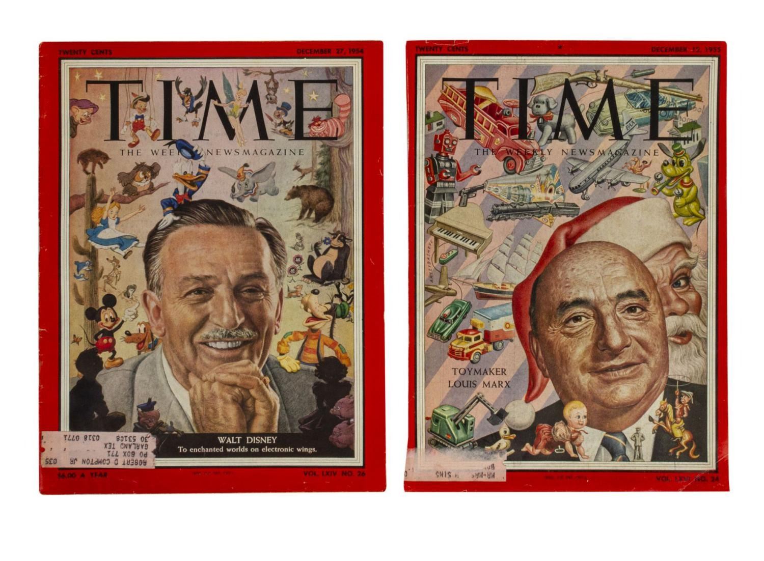 (Time, 1954-55) A December 27, 1954, issue of Time Magazine with a cover story on Walt Disney. Also included is the detached cover from the December 12, 1955, issue of Time with a cover story on toymaker Louis Marx. Measuring 8.25" x 11", the magazine and cover are in good condition with all pages clean and intact, edge and corner wear, and light spine creasing from reading.