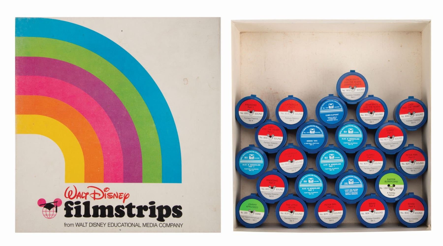 (Disney, 1970s-80s) A collection featuring 24 filmstrips distributed through the Walt Disney Educational Media Company. Each 35mm filmstrip comes within a 1.5"x2" plastic container and is stored in the Walt Disney Fimstrips 12.25"x14"x2.75" box. Each piece is in good condition with expected wear.