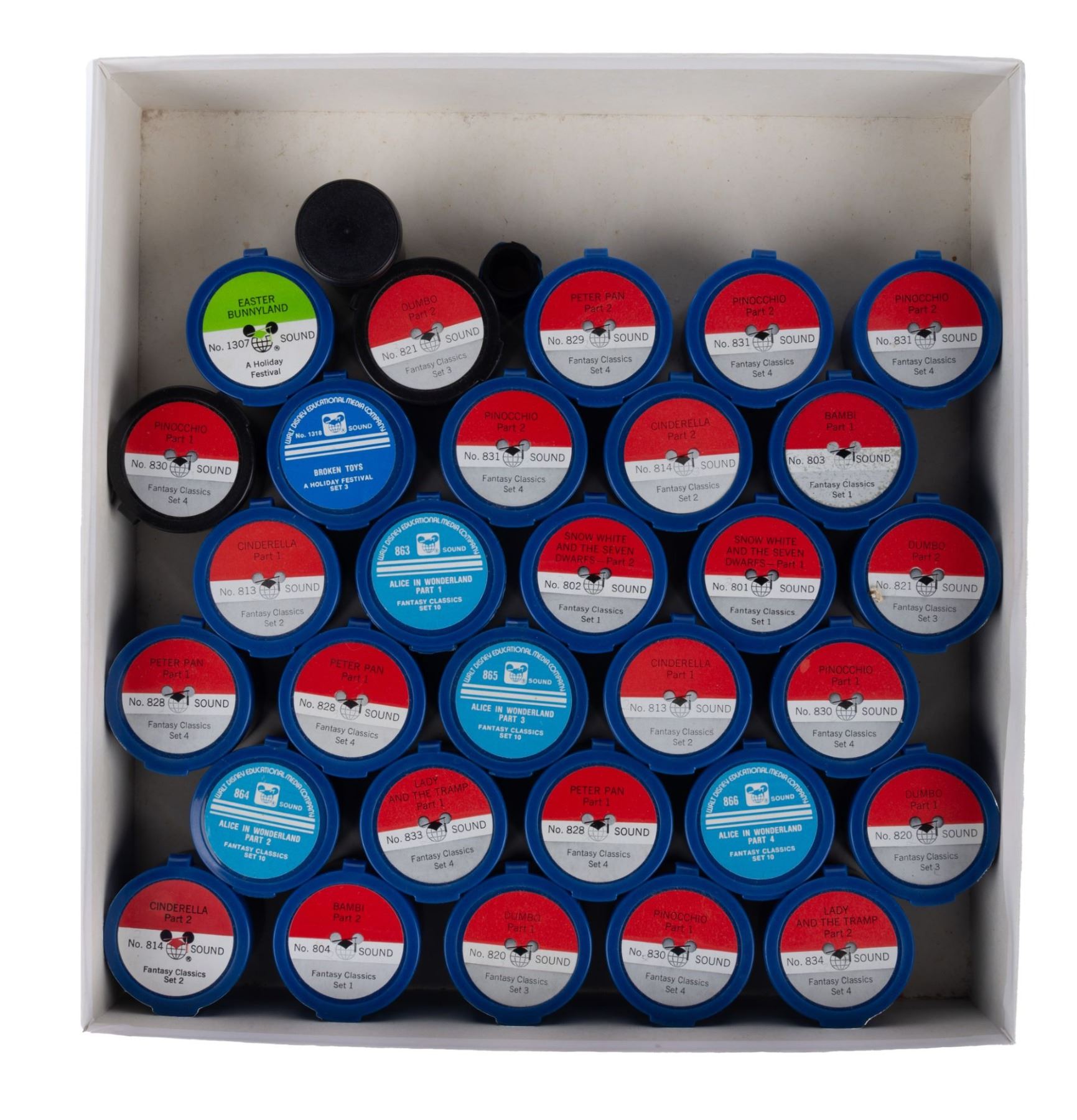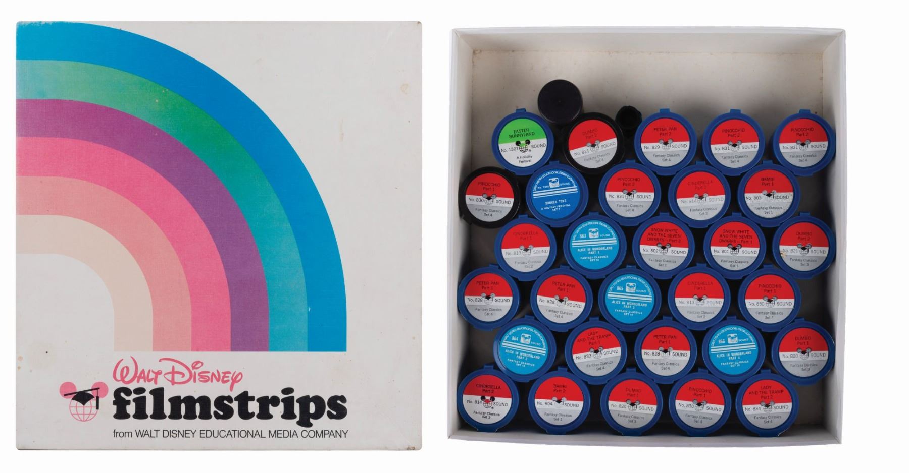 (Disney, 1970s-80s) A collection featuring 30 filmstrips distributed through the Walt Disney Educational Media Company. Each 35mm filmstrip comes within a 1.5"x2" plastic container and is stored in the Walt Disney Filmstrips 12.25"x14"x2.75" box. Each piece is in good condition with expected wear.