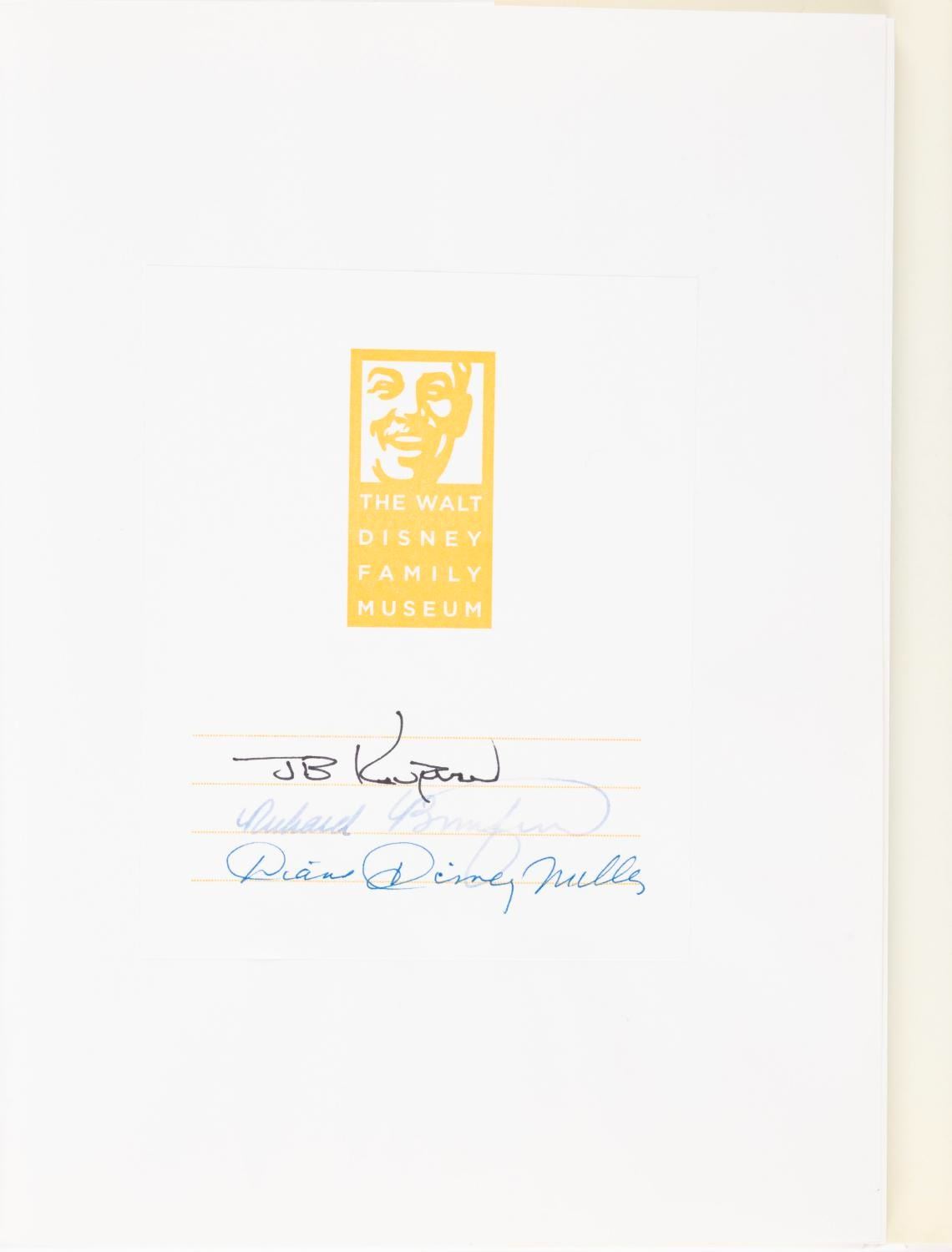 (The Walt Disney Family Museum, 2009) A first edition The Walt Disney Family Museum: The Man, The Magic, The Memories book signed by Diane Disney Miller, Executive Director Richard Benefield, and double-signed by writer J.B. Kaufman. Measuring 7.5” x 9.25”, the book is in good condition with light stains, surface scratches, and wear.